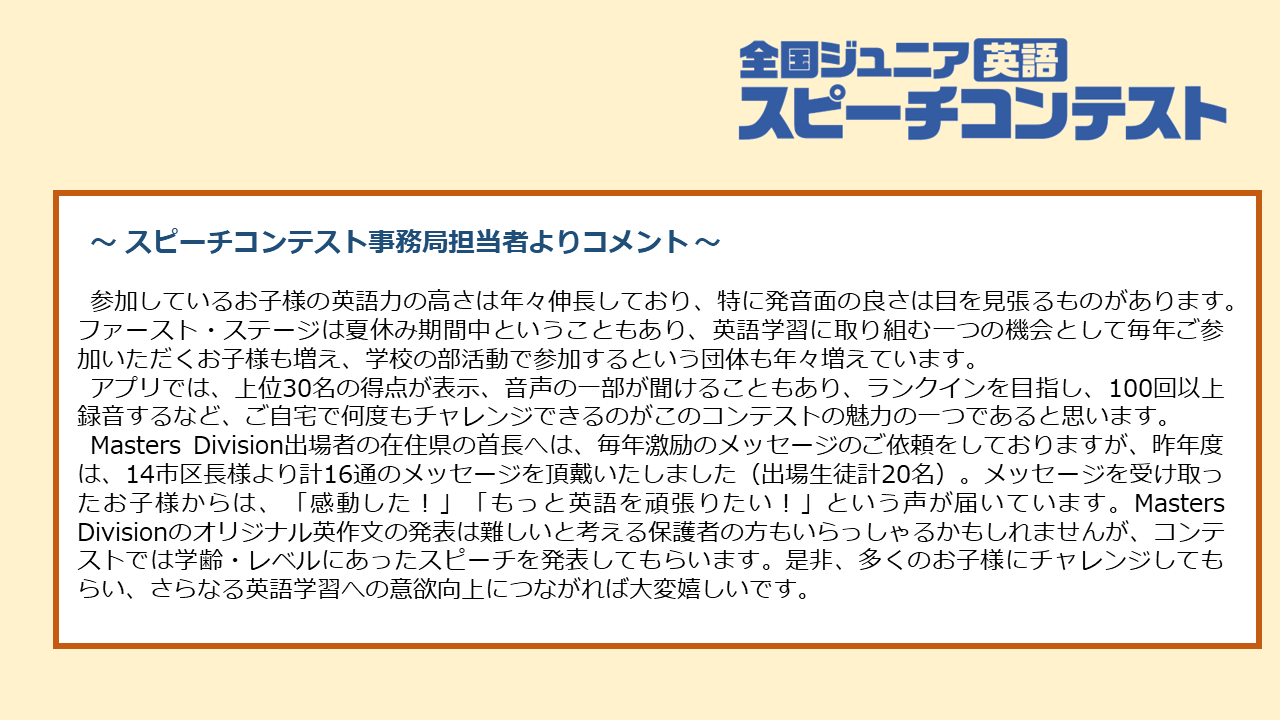 ~日本一伝統ある小学生・中学生が「全国どこからでも」参加できる英語スピーチコンテスト~