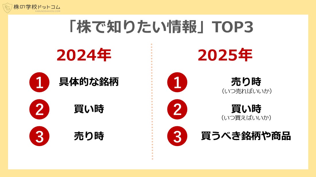 株の学校ドットコムが昨年2月に行った同様の調査では、1位は「銘柄」で、2位「買い時」、3位「売り時」でした。それから1年経って、今回は上位3つが逆転する結果となりました。