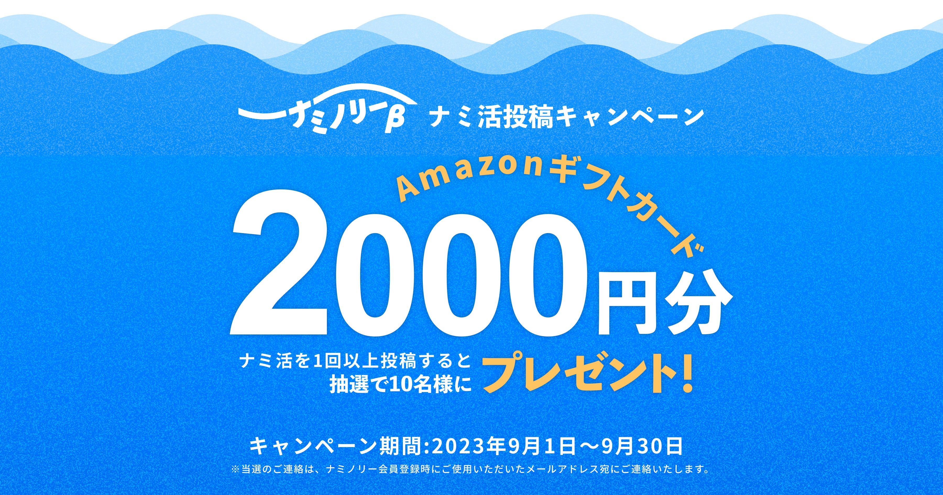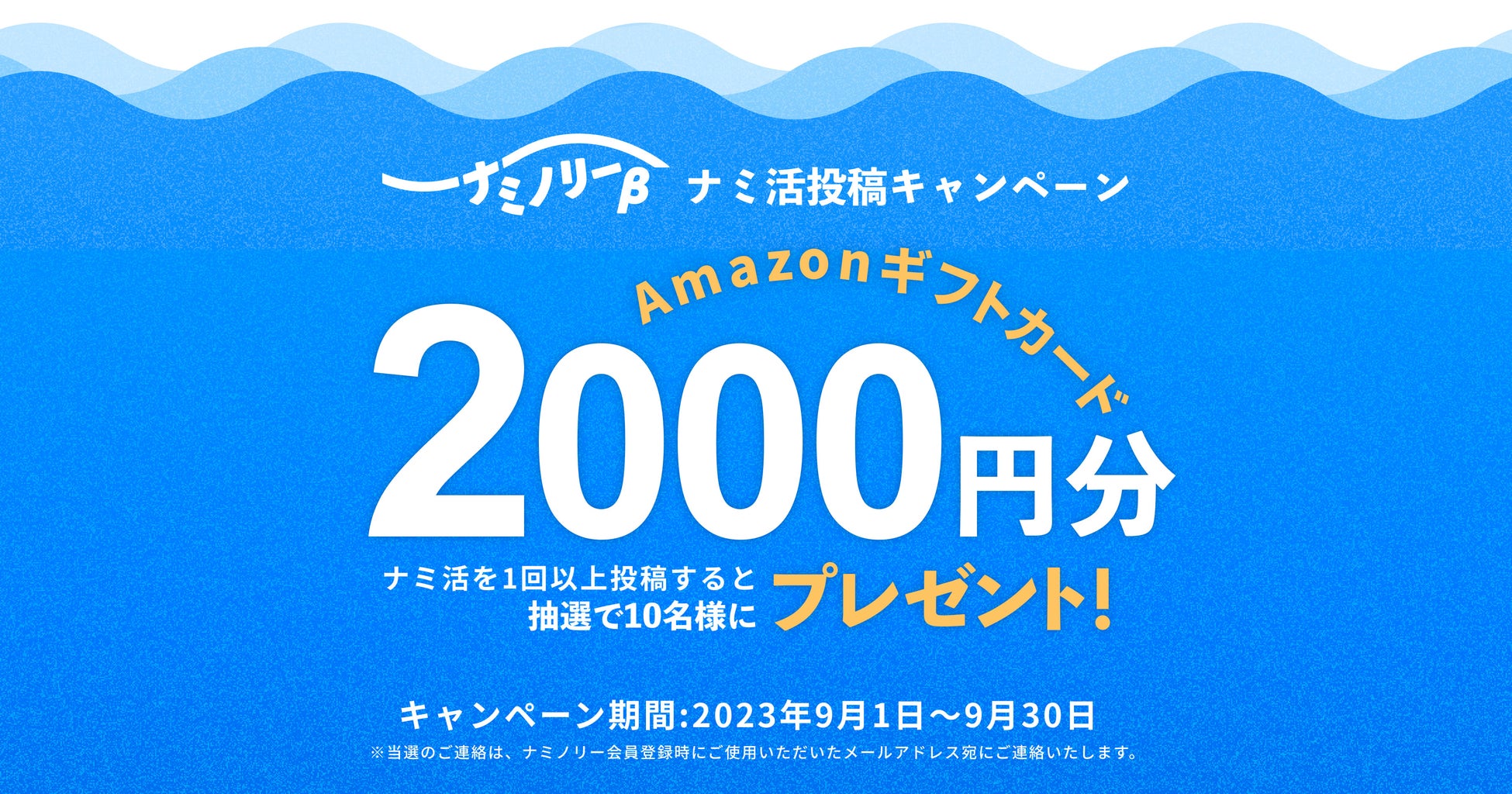ナミノリーではサーフィンを楽しんだ記録を気象情報とともに簡単に記録する『ナミ活』を投稿することができます。もっとたくさんの方にナミノリーをお楽しみいただくべく、ナミ活投稿キャンペーンを企画しました。期間中に『ナミ活』を投稿した方の中から、抽選で10名様にAmazonギフトカード2,000円分をプレゼントいたします。ぜひこの機会に『ナミ活』を投稿してみてください。