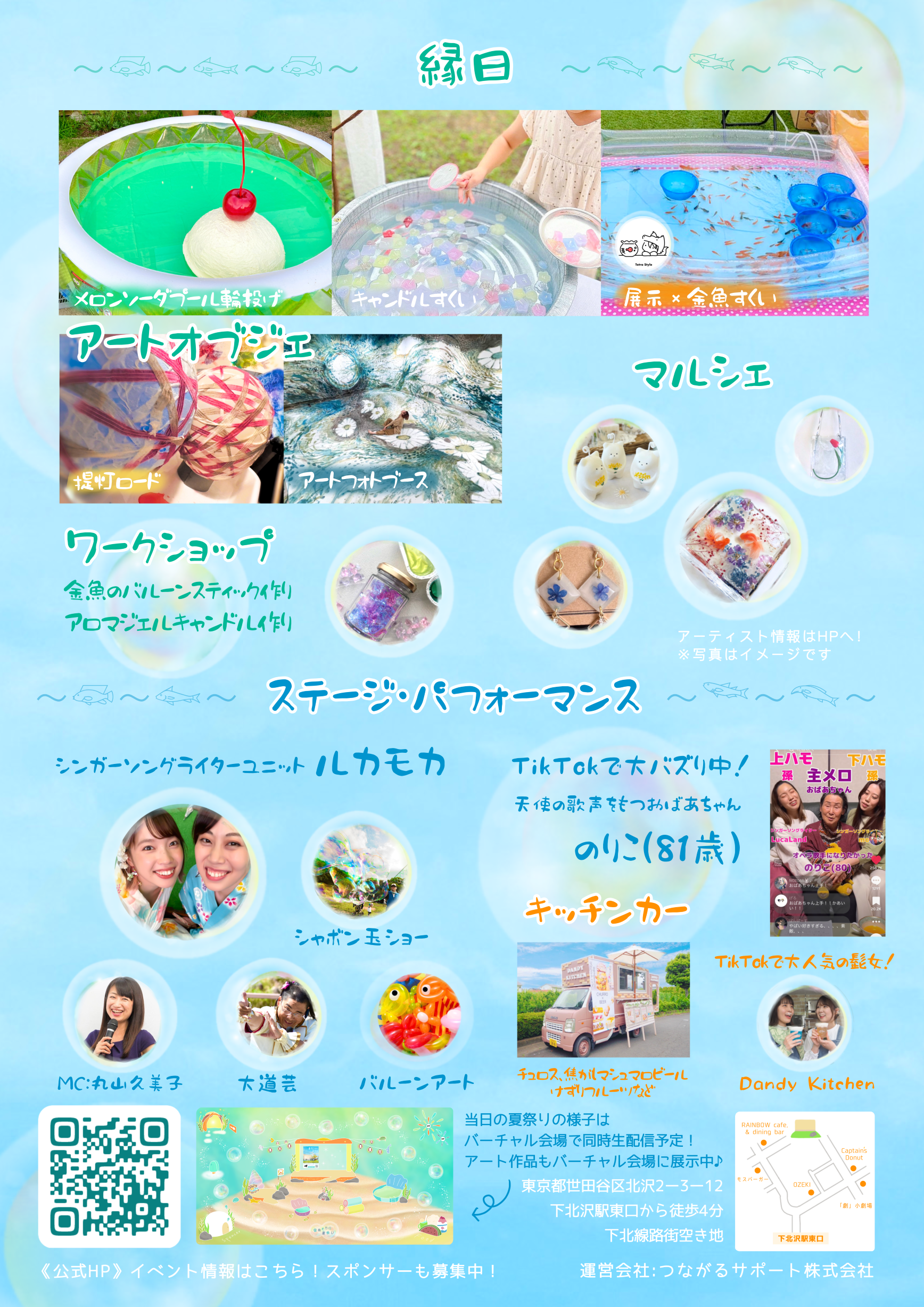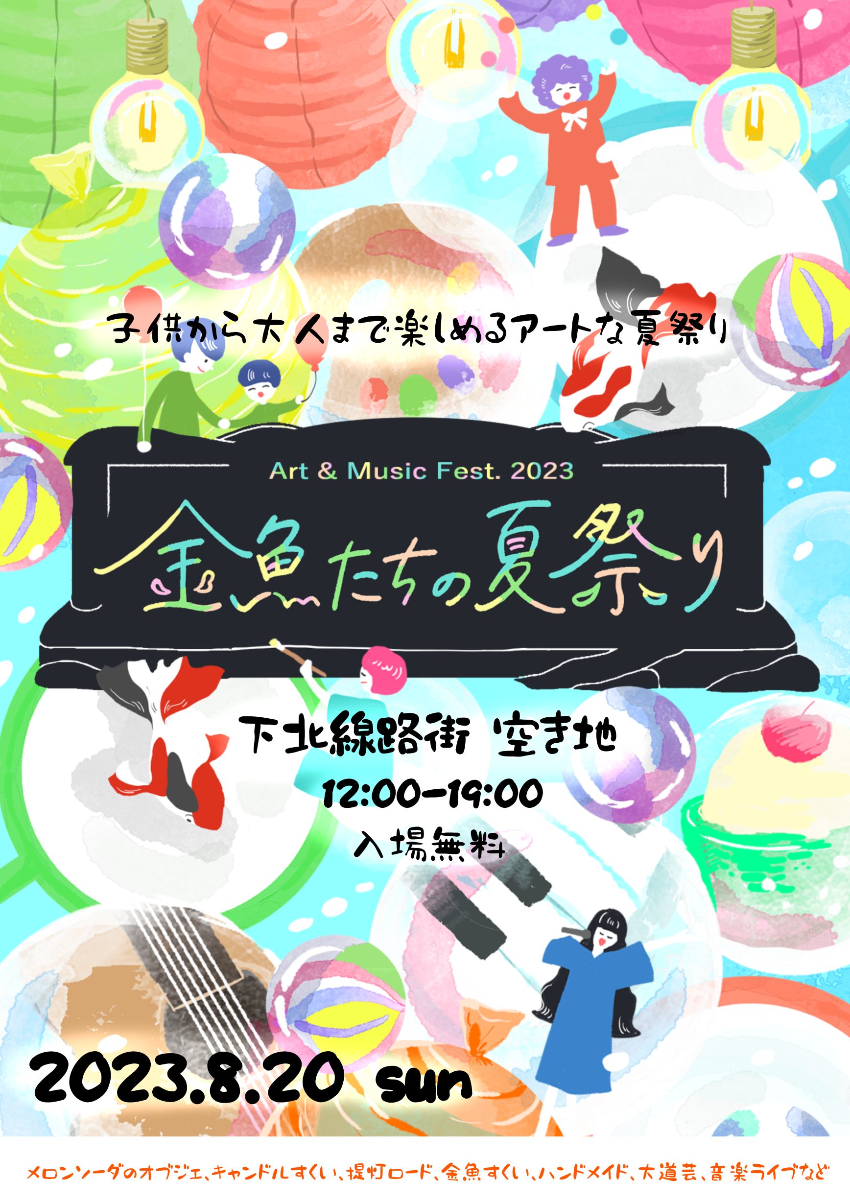 今年で3年目になる金魚たちの夏祭り。それぞれの夢や想いが詰まった泡が「シャボン玉」になって、下北沢の青空へ飛んでいくー。そんな空間をイメージしながら、アーティストの個性が虹色にキラッと光るような会場で、皆さんに夏の思い出をお届けできたらいいなと思っています♪アートな夏祭り、ぜひ楽しみにしていて下さい^^♡