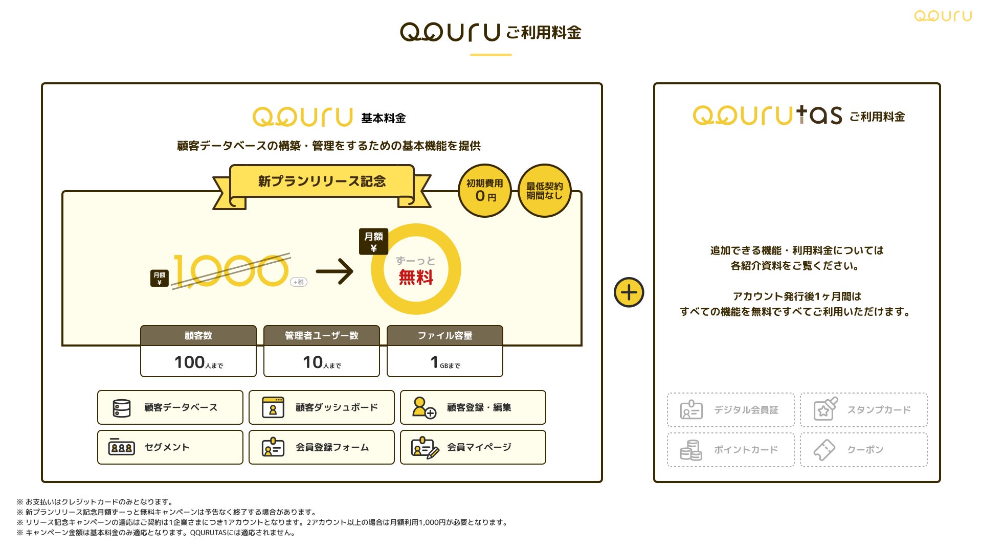 LINE公式アカウントと連携した顧客データベースや会員制度・CRMを簡単に構築できるSaaSサービスQQURU。新プランリリース記念として、契約期間中の基本料金がずっと無料になるキャンペーンを実施中。