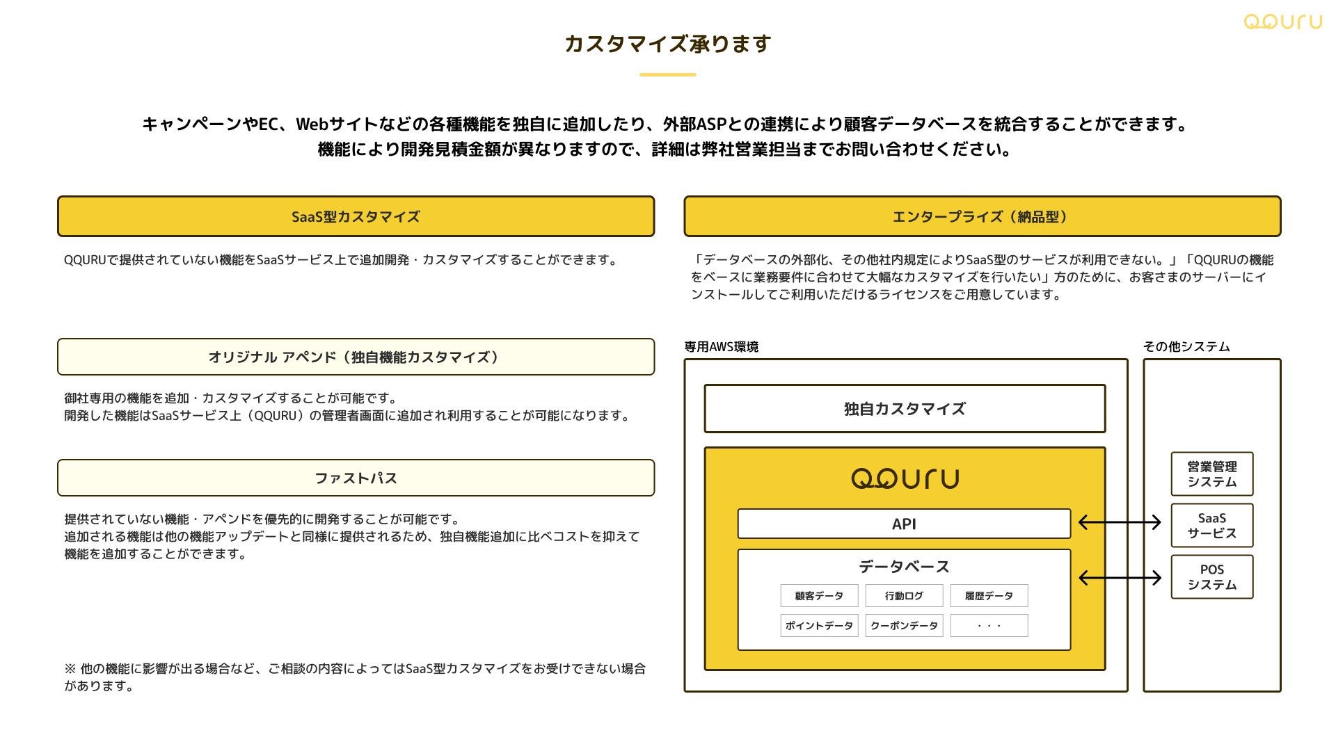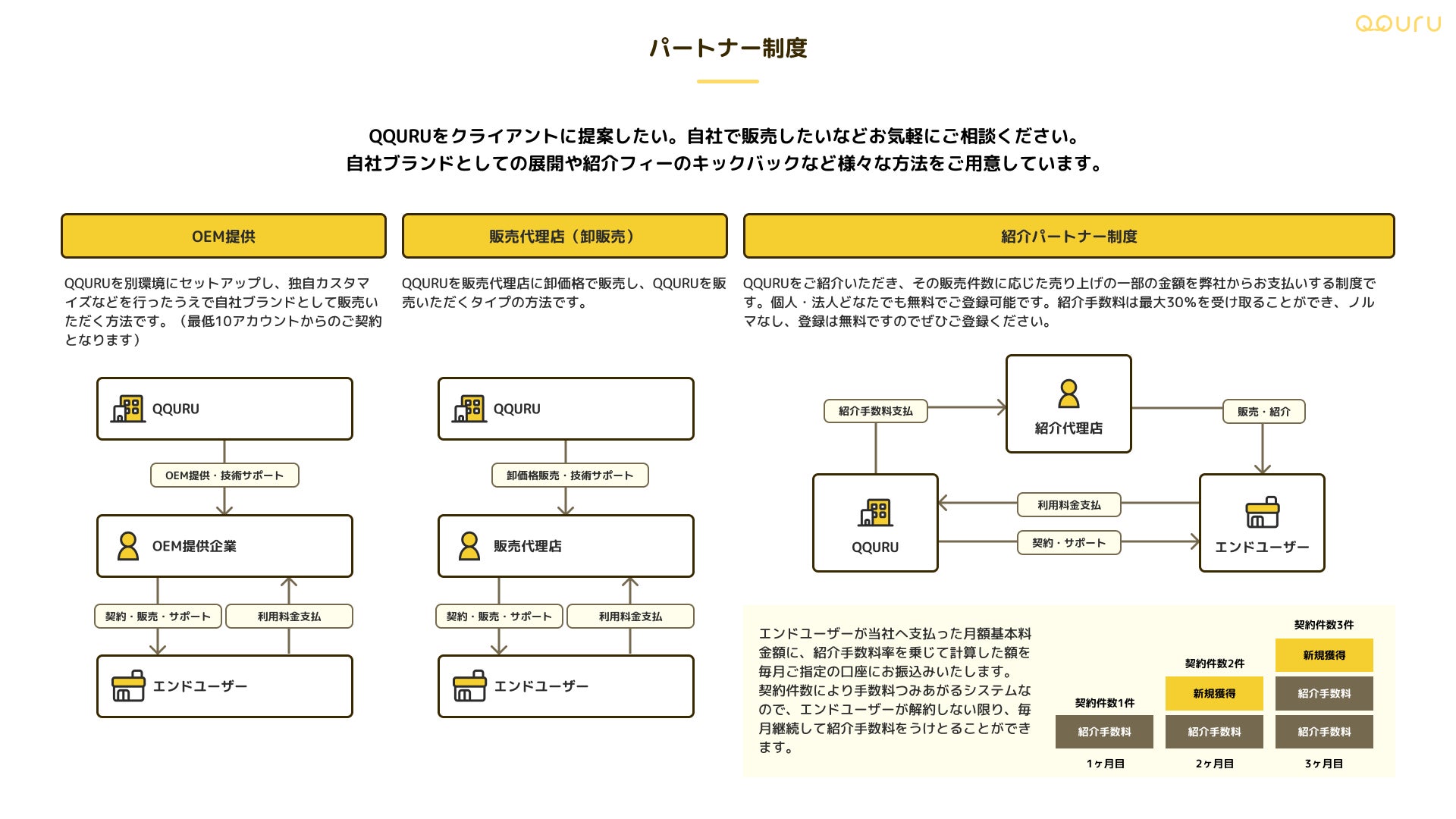 QQURUをベースプラットフォームとして、独自機能追加開発やOEM形式での提供、クライアント管理のサーバーへのプログラム納品など様々な提供方法をご用意しています。 詳細の説明をご希望の方はお問い合わせください。