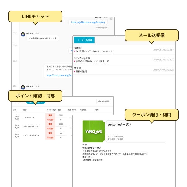 これらの機能を組み合わせることで、「アンケート回答時にポイントを付与し利用活性を促進する」「チェックインによるスタンプ発行」などのインセンティブ提供や、収集したデータを活用し、特定の条件を達成した会員へのクーポン発行など様々な集客施策を行うことが可能となります。
