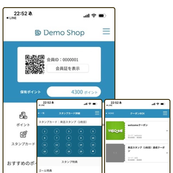「デジタル会員証」「スタンプカード」「クーポン」「ポイント制度」など顧客体験の向上やリピート利用を向上させるための様々なサービスを提供することができるようになります。 -