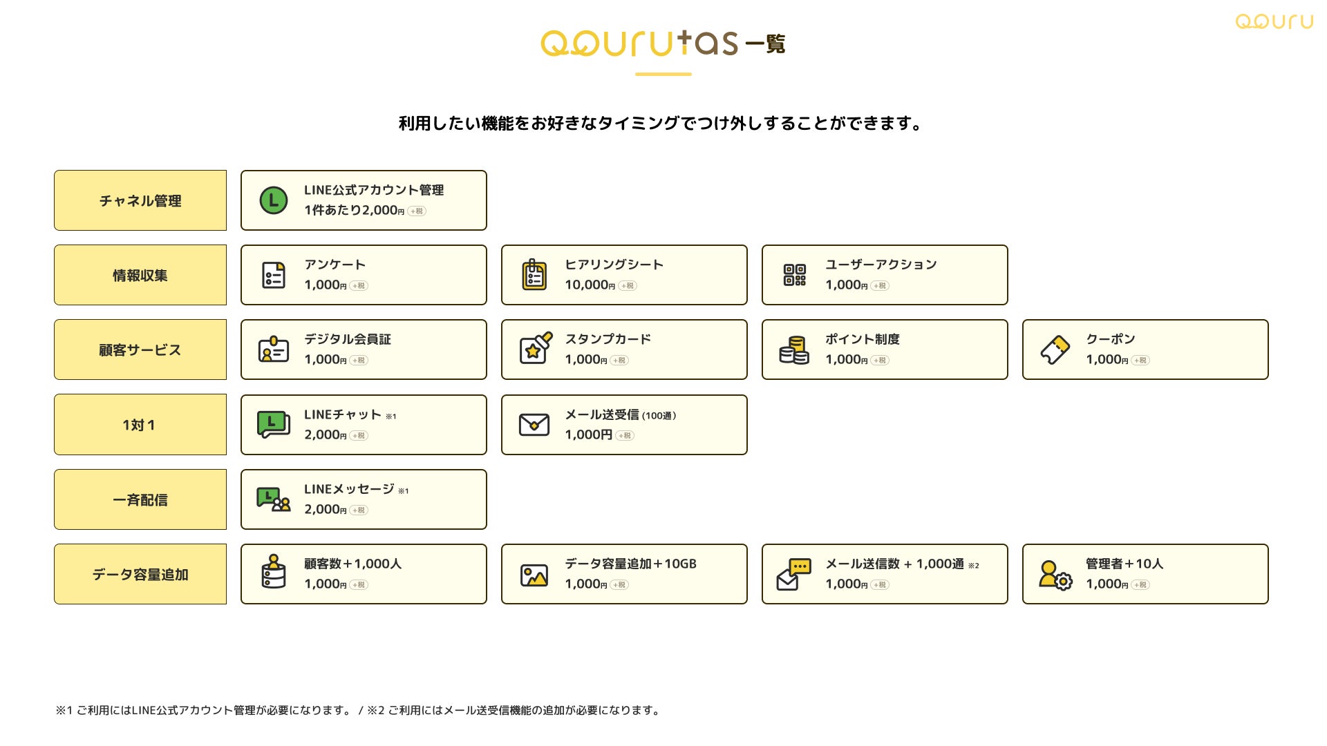 基本機能に手軽にマーケティング機能を足し引きできる「QQURUTAS」。 LINE公式アカウント管理、アンケート機能、ヒアリングシート、ユーザーアクション収集、デジタル会員証、スタンプカード、ポイント制度、クーポン機能、LINEチャット、メール送受信、LINEメッセージ一斉配信など、必要な機能を自由に選んで追加可能です。 -