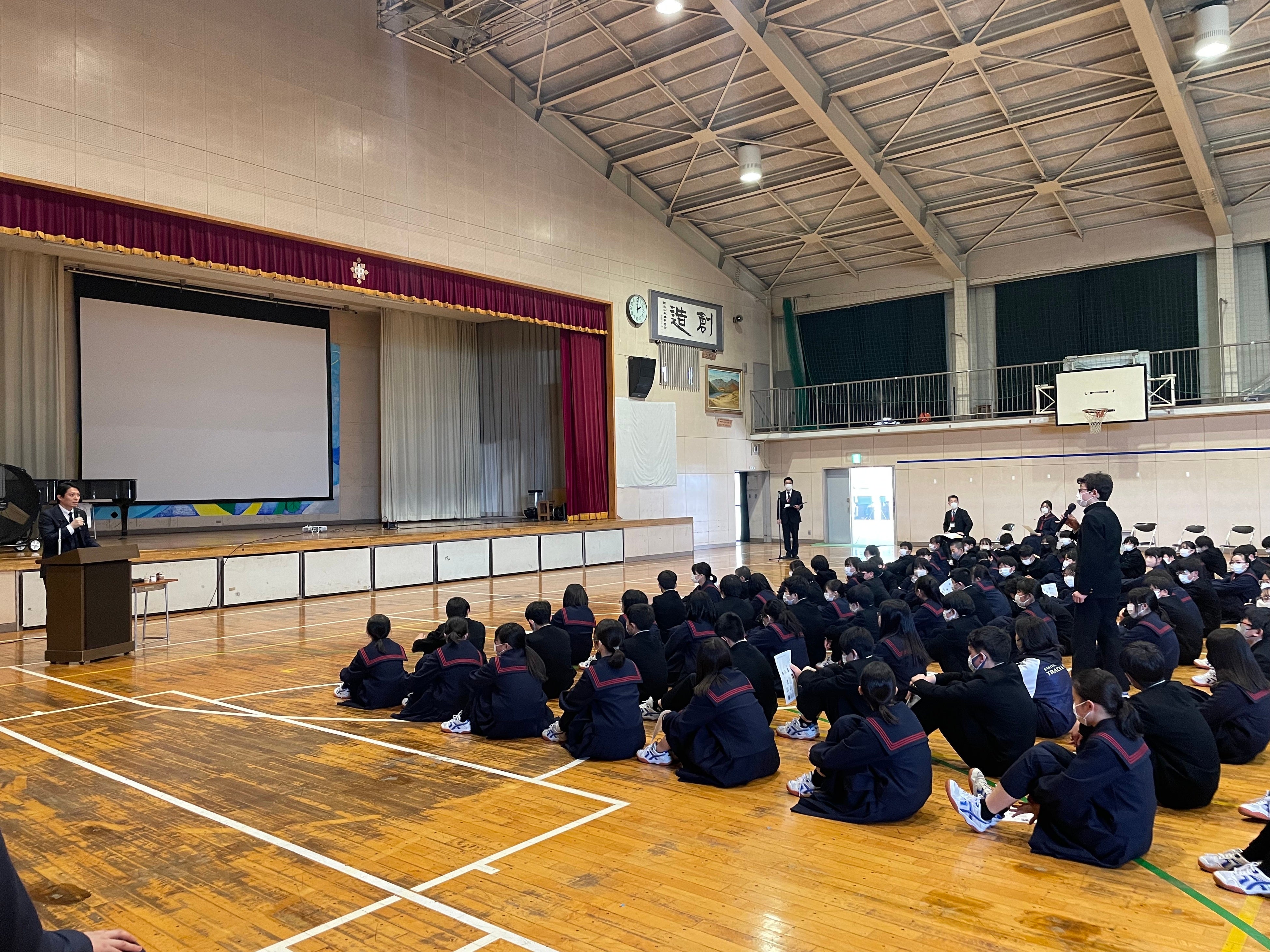 4月28日は代表取締役 春日 秀之から生徒たちへプロジェクトの内容を説明した後、ペンケースを配布。生徒たちとの意見交換では循環型素材についてや、その活用方法、アップサイクルのための回収方法まで活発な質問が生徒たちから投げかけられました。