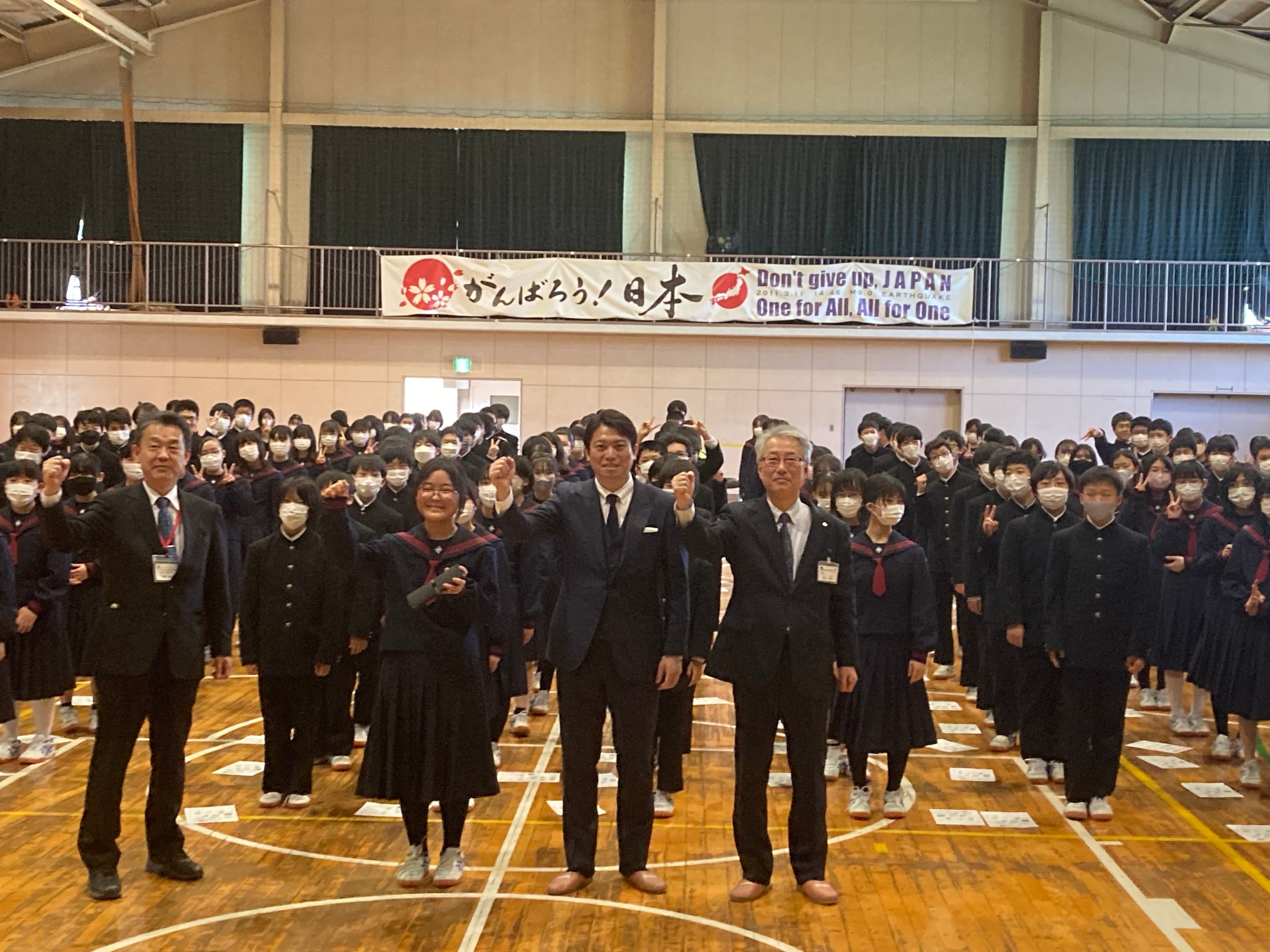 東部中学校ではSDGsを教育の柱の一つに掲げ、総合的な学習の時間や生徒会活動などを通して視点を育てています。そんな中、昨年に春日様からいただいたアップサイクルのお話は、実体験を通して環境や循環型社会の意識を高める良い機会と考え一緒に取り組ませていただくことになりました。本校では、自分で考え判断し、自ら行動する、そんな生徒の育成を目指しており、今回のプロジェクトでもやりたい生徒たちが集まり、ペンケースを使うということも自分たちで決めました。今日から皆さんが毎日使うペンケースが二年後三年後、形を変えてどんなふうになっていくのか?そのようなことをイメージしながらSDGSの考え方をさらに深めていってほしいと思います。