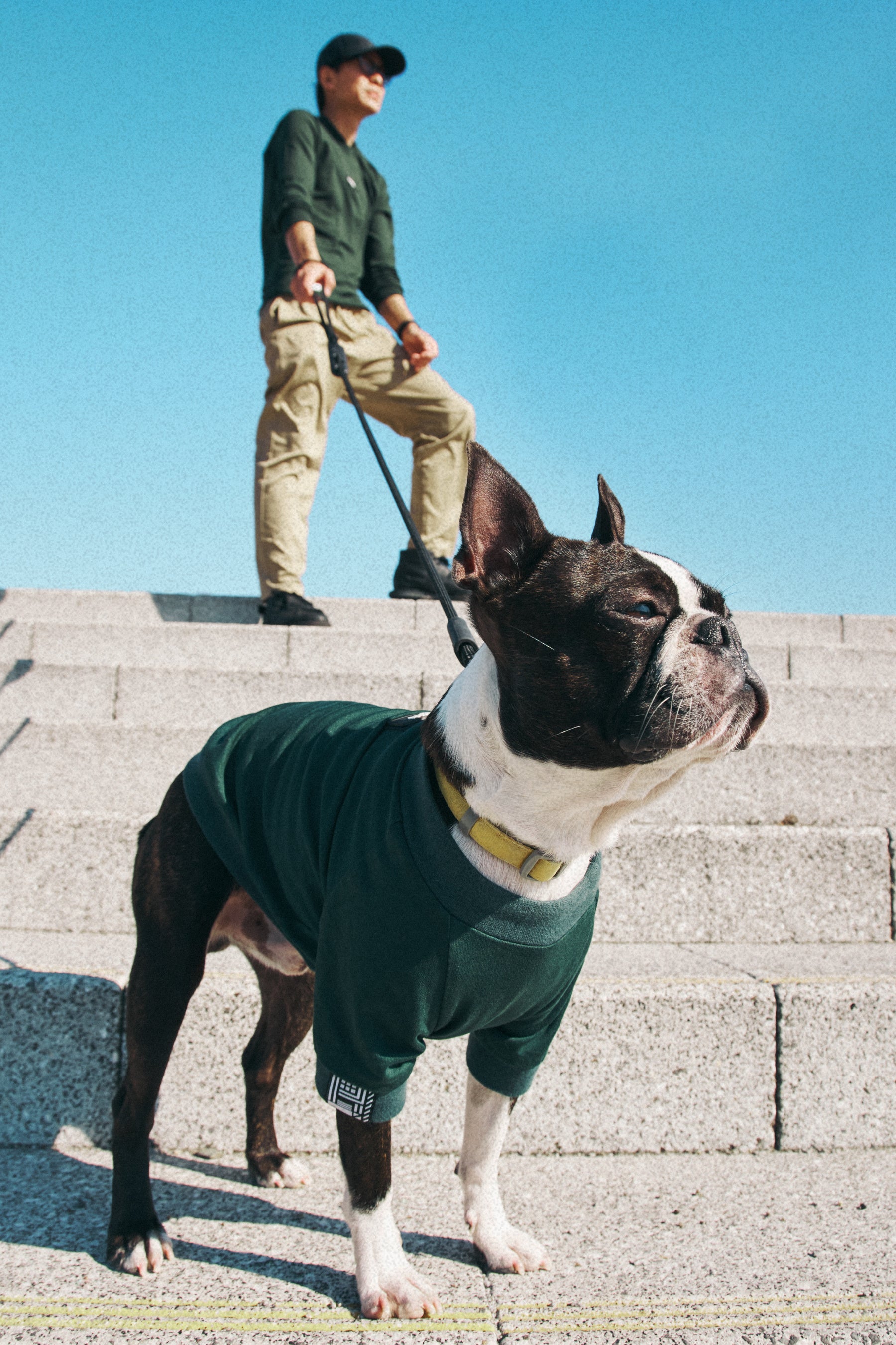 【特徴】通気性がよく、厚すぎない生地なので単体での着用はもちろん、重ね着にも適しており、オールシーズン着ていただけるアイテムです。人服は程よいフィット感とさらっとした素材感が特徴。犬服はふくらみのあるやわらかい生地感のあるチャコール/グレーと適度なハリ感のある、さらっとした生地感のフォレストと2種類の生地を採用しています。