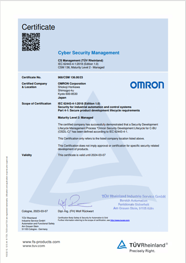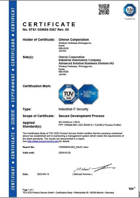 オムロン株式会社(本社: 京都市下京区、執行役員社長 CEO: 辻永順太)は、インダストリアルオートメーションビジネスカンパニー 商品事業本部 コントローラ事業部およびアドバンスドソリューション事業本部*1が、産業用オートメーションおよび制御システムで使用されるセキュアな制御機器を開発するためのプロセス・組織要件を規定する国際標準規格「IEC 62443-4-1」の第三者認証を2023年3月に取得しましたので、お知らせいたします。