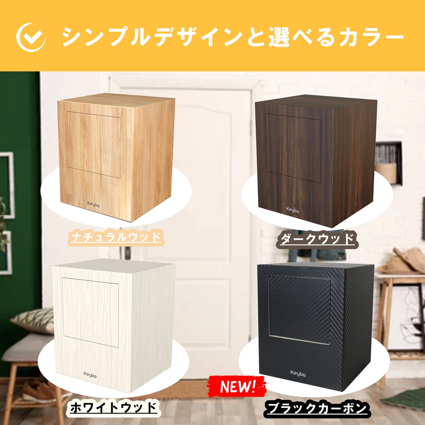 ご家庭のどんな場所でもしっくりとくる、洋風、和風を問わないシンプルなスクエア外観で、本体カラーはインテリアに合わせやすい木目調&カーボン調の4種類のカラーからお選び頂けます。