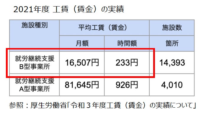 2021年度の平均工賃は約1.6万円/月、時給に換算すると233円と非常に低く、経済的自立は難しい状況となっております。