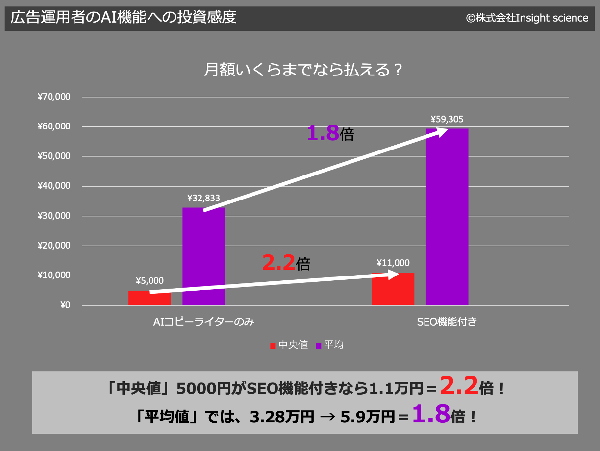 それでは、いったいどれくらい金額投資を考えているかについて聞いてみると、平均値にして、5.9万円/月額との回答が得られました。これはSEO機能がない状態に比べ、2.2倍の結果となり、その期待度が高いことが見えます。また、中央値では、1.1万円/月(SEOなしの1.8倍)となり、全体ではまだコストをかけたくない、または少額なら投資可能と考えている広告運用者が多いことがわかりました。まだ生成AIが登場して1年経たない状況ですが、多くの方が投資を考えていることが読み取れます。