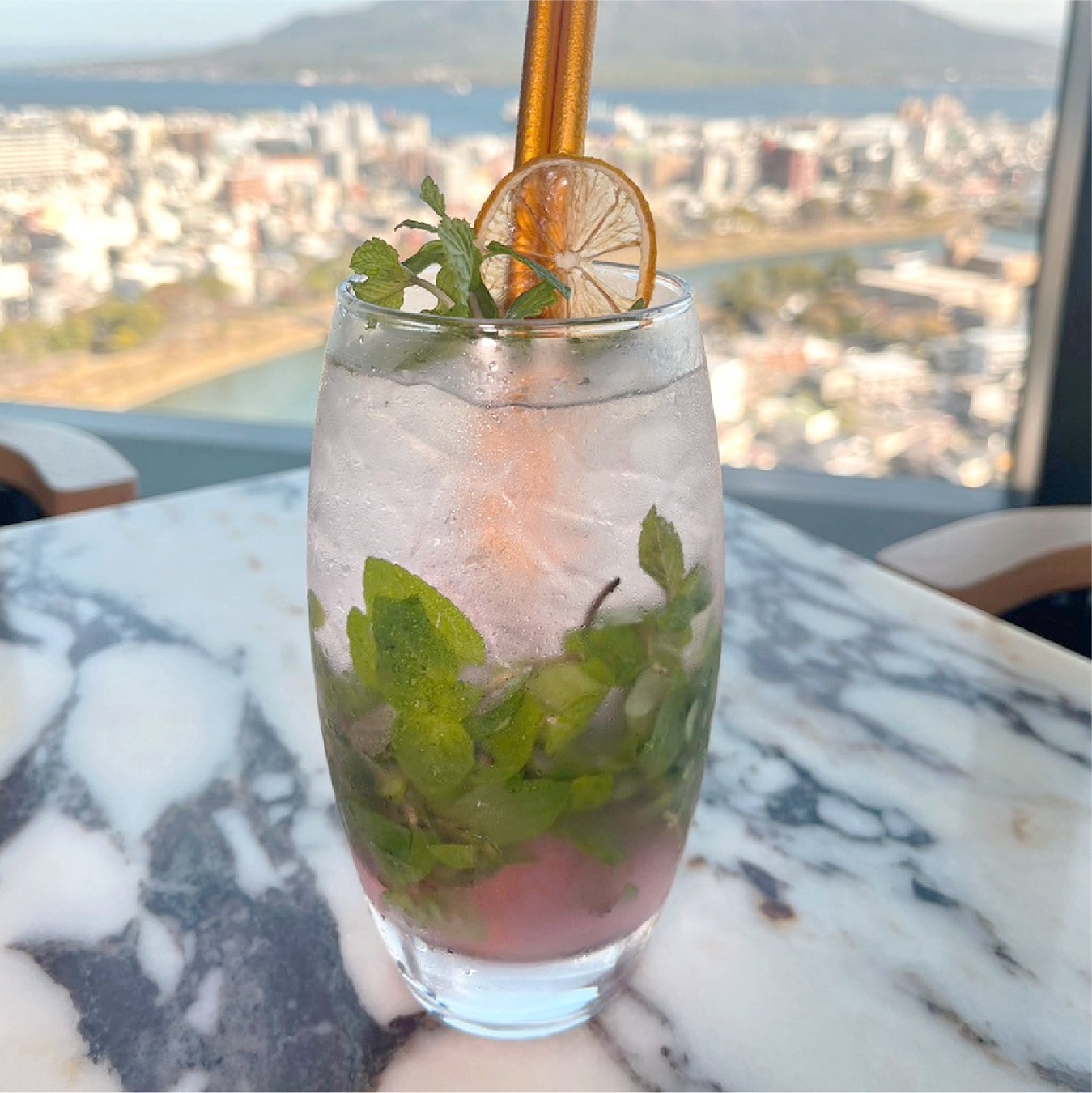まるで植物園のように空間全体に緑が広がる最上階のメインバー「ビバリウム」。室内やテラスから漂うバジルやローズマリーの爽やかな香りに癒されながら、刻一刻と姿を変える桜島や錦江湾、甲突川の大パノラマを眺めるのも素敵な時間。オーセンティックなものからミクソロジーなものまで、摘みたてのハーブを使い、古いものと新しいものを融合したクリエイティブなカクテル、ウイスキーや焼酎など、鹿児島の名酒まで取り揃えています。