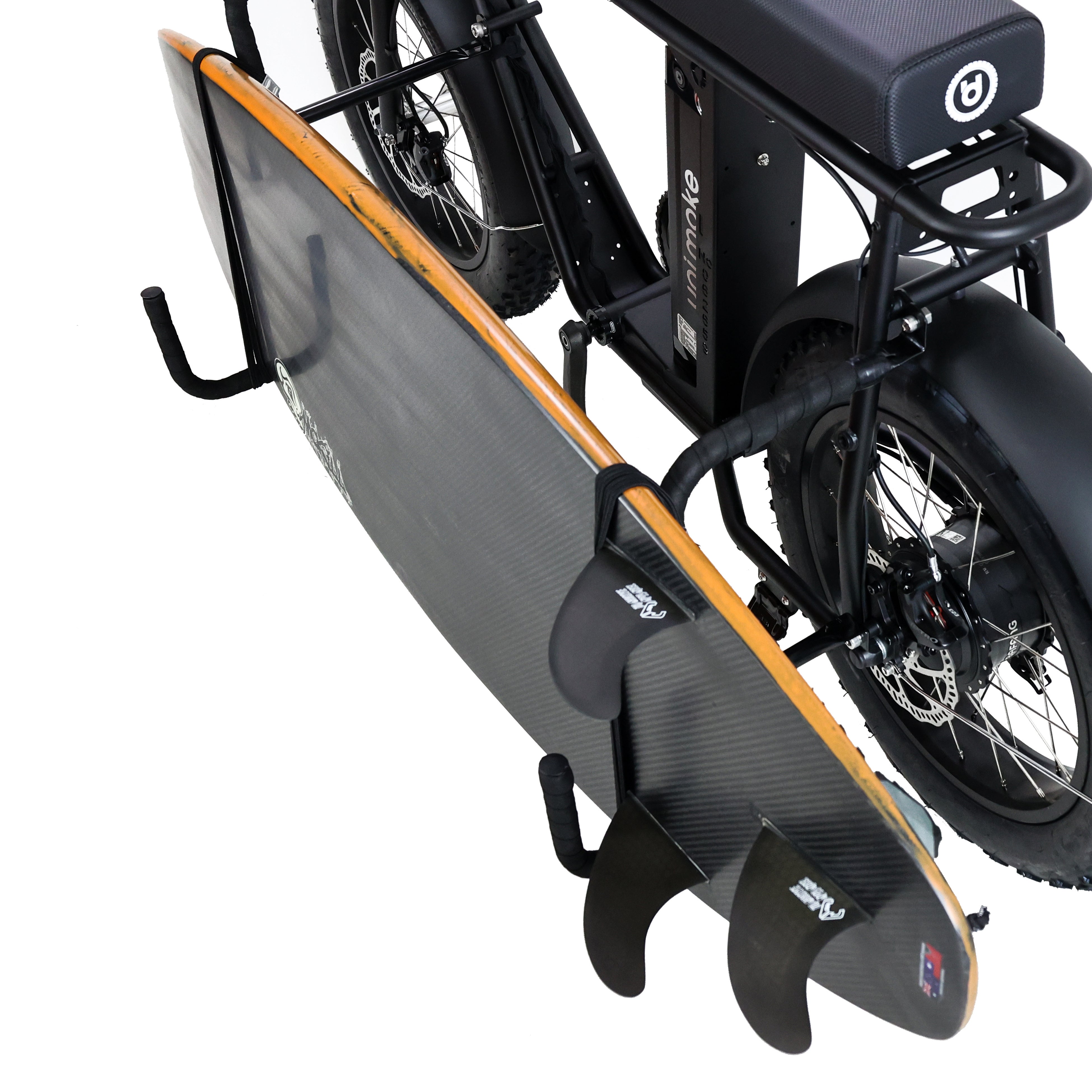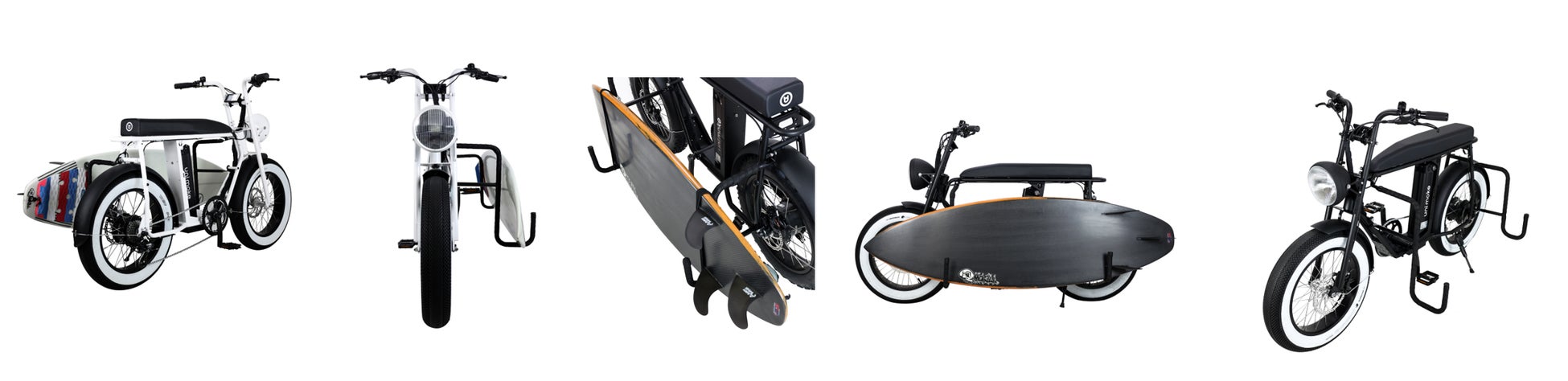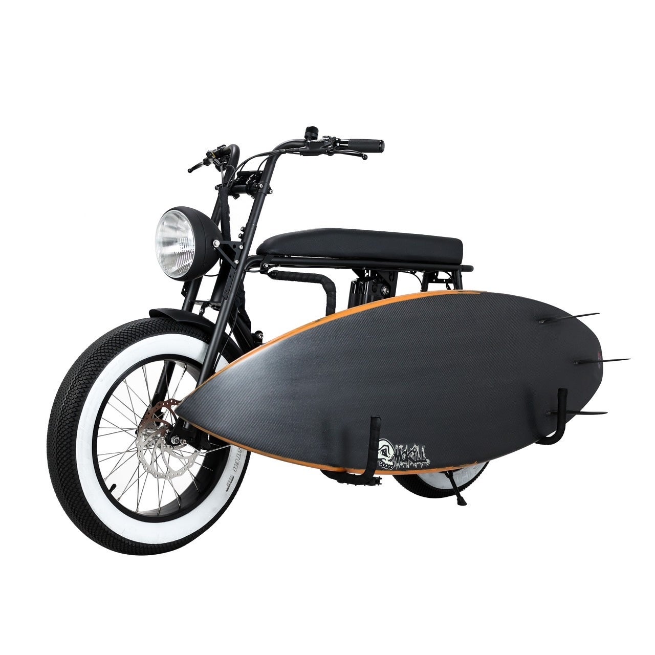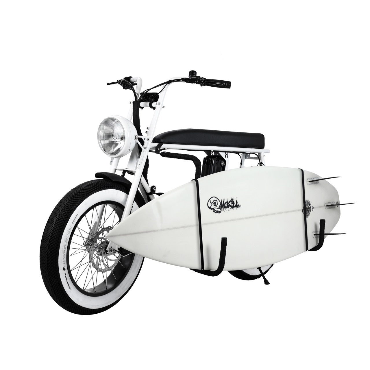 Unimoke MKにサーフボードスタンド、VEEタイヤホワイトウォールがカスタムされた限定サーフモデルが登場。車体には、丈夫で乗り心地の良いクロモリフレームに、クッション性の高いロングシート、SHIMANO7段変速機とアシスト5モード、Panasonic製リチウム電池に500Wモーターなど大満足なハイスペックファンクションを搭載しています。また、この限定モデルには砂浜や濡れた路面を走行することをあらかじめ想定し、前後フェンダーも標準装備。波乗りポイントを探すのにもってこいのサーフモデルに仕上がっています。