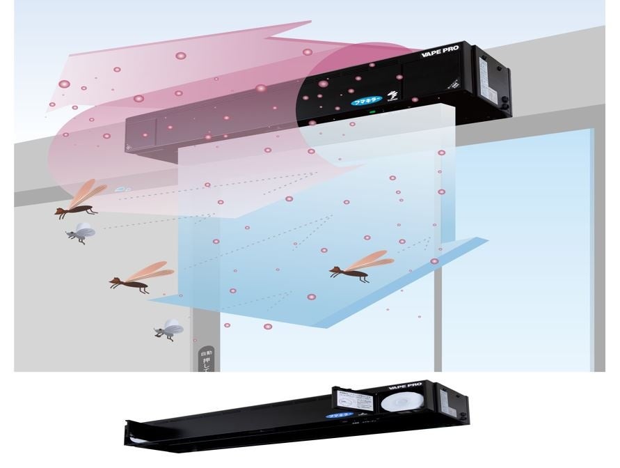 防虫エアカーテンは、気流により虫忌避剤を拡散し虫の侵入を防ぐ防虫システム(フマキラー社共同開発)です。虫忌避剤には忌避効果に定評のあるフマキラー社の「ウルトラベープPRO」を使用しています。