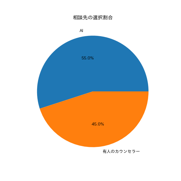 それを踏まえ、私たちが実施したアンケートでは、「AIによるカウンセリングを受けたい」と回答した方が55%、「心理士のカウンセリングを受けたい」と回答した方が45%でした。