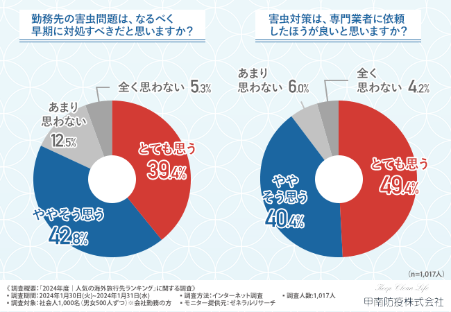 8割超の方が、職場の害虫問題を早急に行ってほしいと思っていることが明らかになりました。
