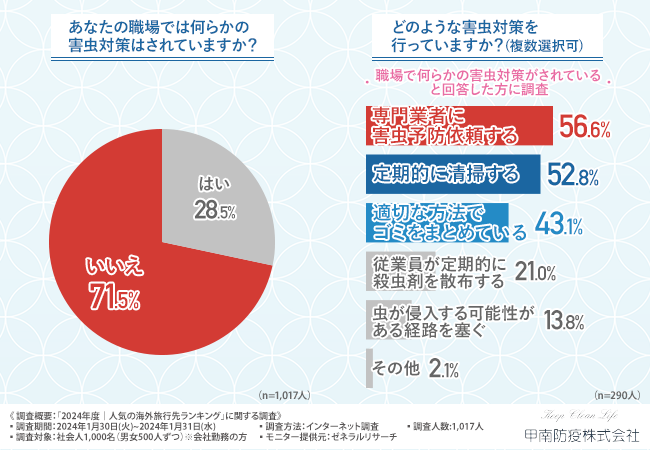 また、身近な事象として「あなたの職場では何らかの害虫対策はされていますか?」と質問したところ、約7割の方が『いいえ(71.5%)』と回答しました。