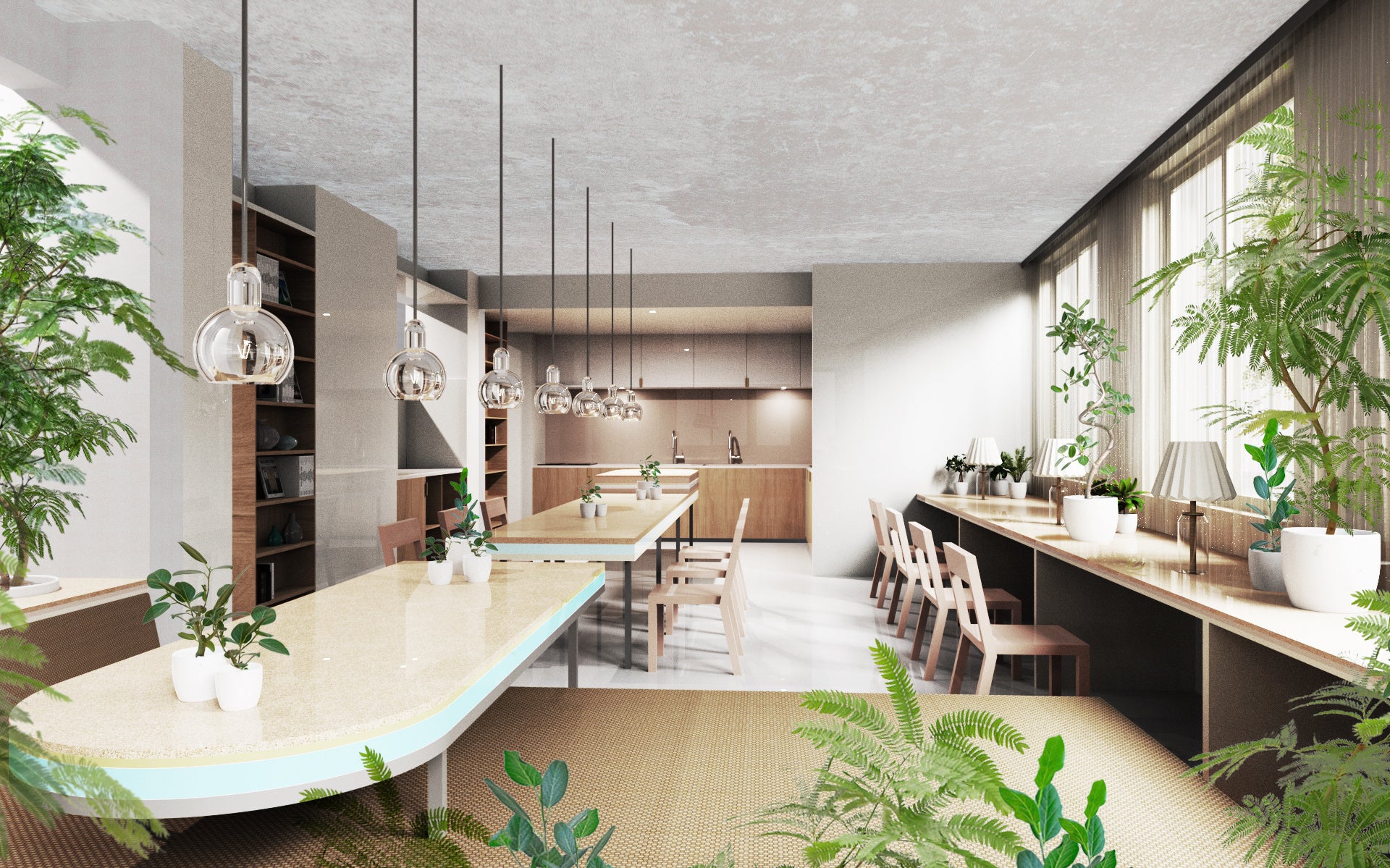 自然光が降り注ぐ、たくさんの緑を配置した共用部には、リビングダイニング、ワークスペース、キッチン、ランドリースペースを完備