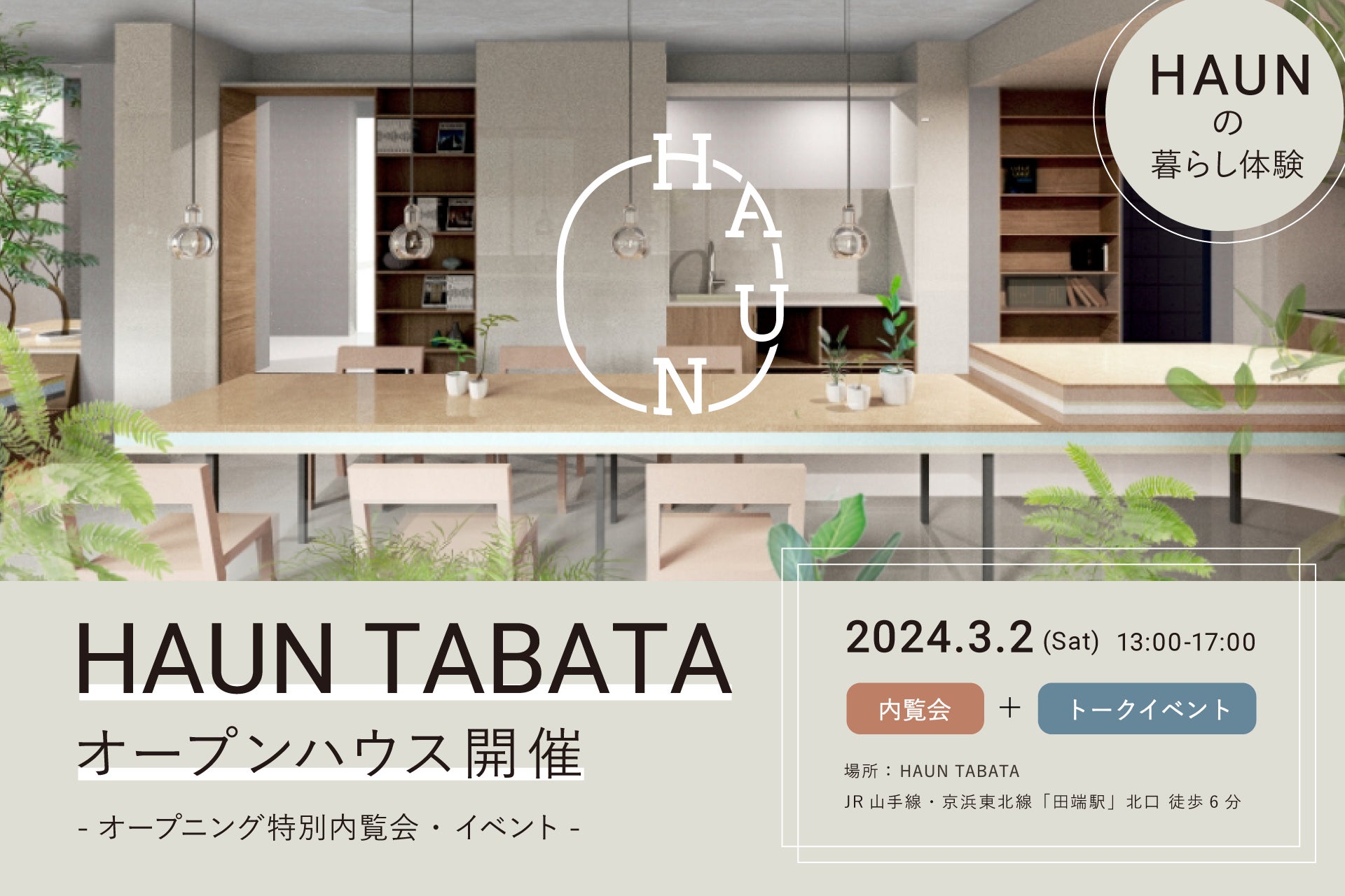HAUN TABATAの開業に伴い、2024年3月2日(土)にオープニング特別内覧会・イベントを開催いたします。当日は、物件の内覧に合わせて、HAUN TABATAでの暮らしを体感いただけるアートや食のコンテンツや、「心地よい暮らし」をテーマにしたトークイベントをご提供いたします。HAUN TABATAにご興味のある方はどなたでもご参加いただけるイベントとなっております。