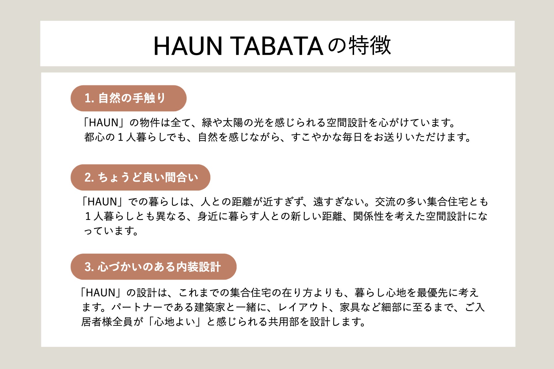 HAUNの第一棟目となるHAUN TABATA(田端)は、JR山手線、京浜東北線「田端駅」徒歩6分、下町情緒あふれる静かな住宅街に、2024年3月1日(金)にオープンいたします。