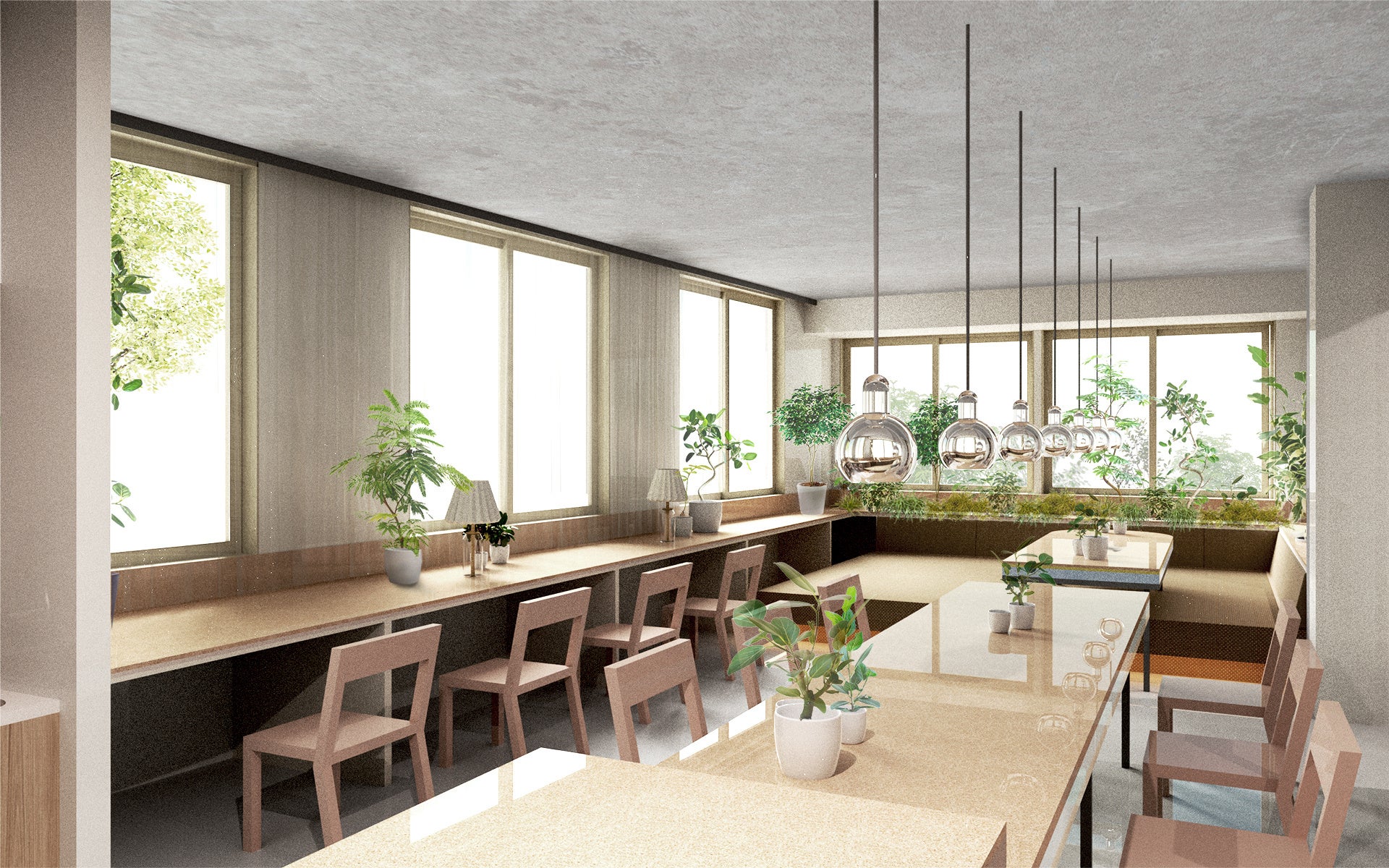 HAUNの内装は、木材や、あたたかいグレージュとやわらかなグリーンをベースに、ジェンダーにとらわれないニュートラルな、上品かつリラックスした色彩空間を目指します。家具はどんな人にも親しみやすいシンプルなデザインのものを揃えます。