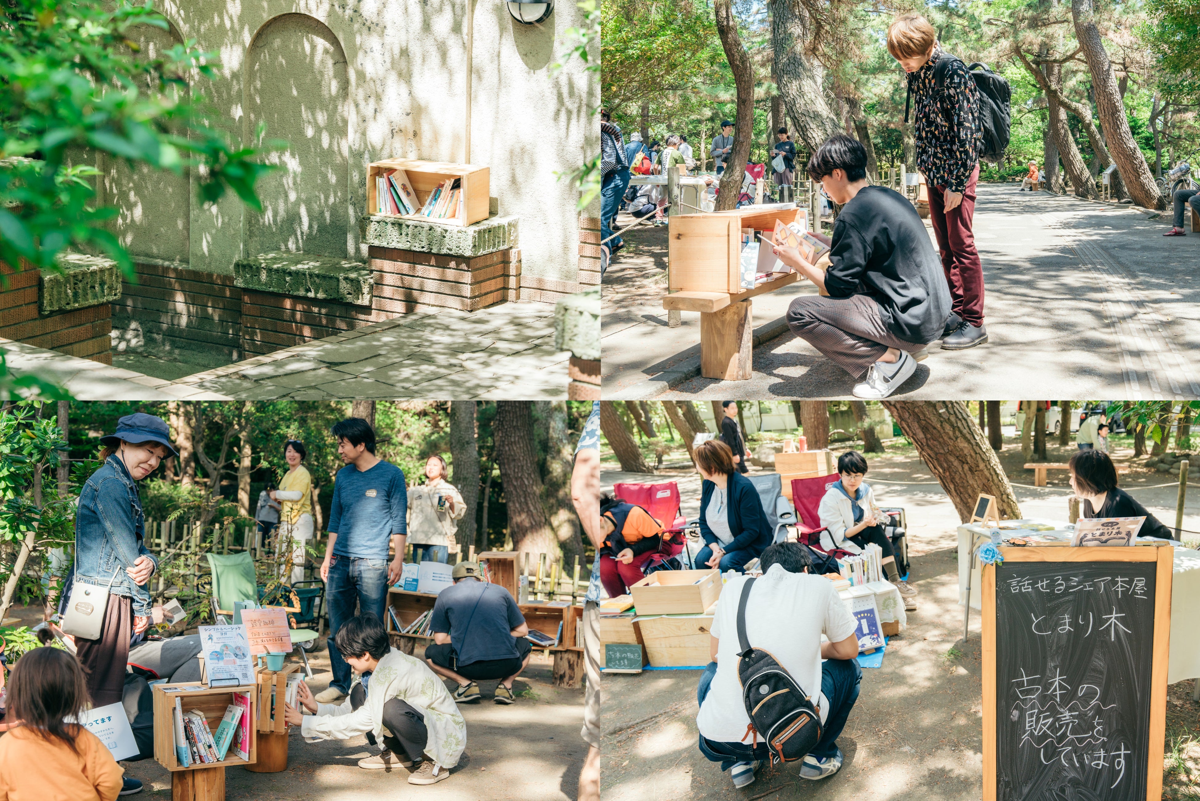 それから松林の間を縫うように回遊できる沿道沿いには、無料で本を物々交換できる「ブックトレードbyまちなか本棚」と「うみべのとしょかんbyCの辺り Coworking&Library」の本棚が設置され、さらに今年は「話せるシェア本屋とまり木」の本棚で古本の販売も行いました。この日、本棚と同じく緑地内に増設されたベンチには、本を読む人、休息をとる人の利用があり、高砂緑地をより楽しんでくださる方々の姿がありました。