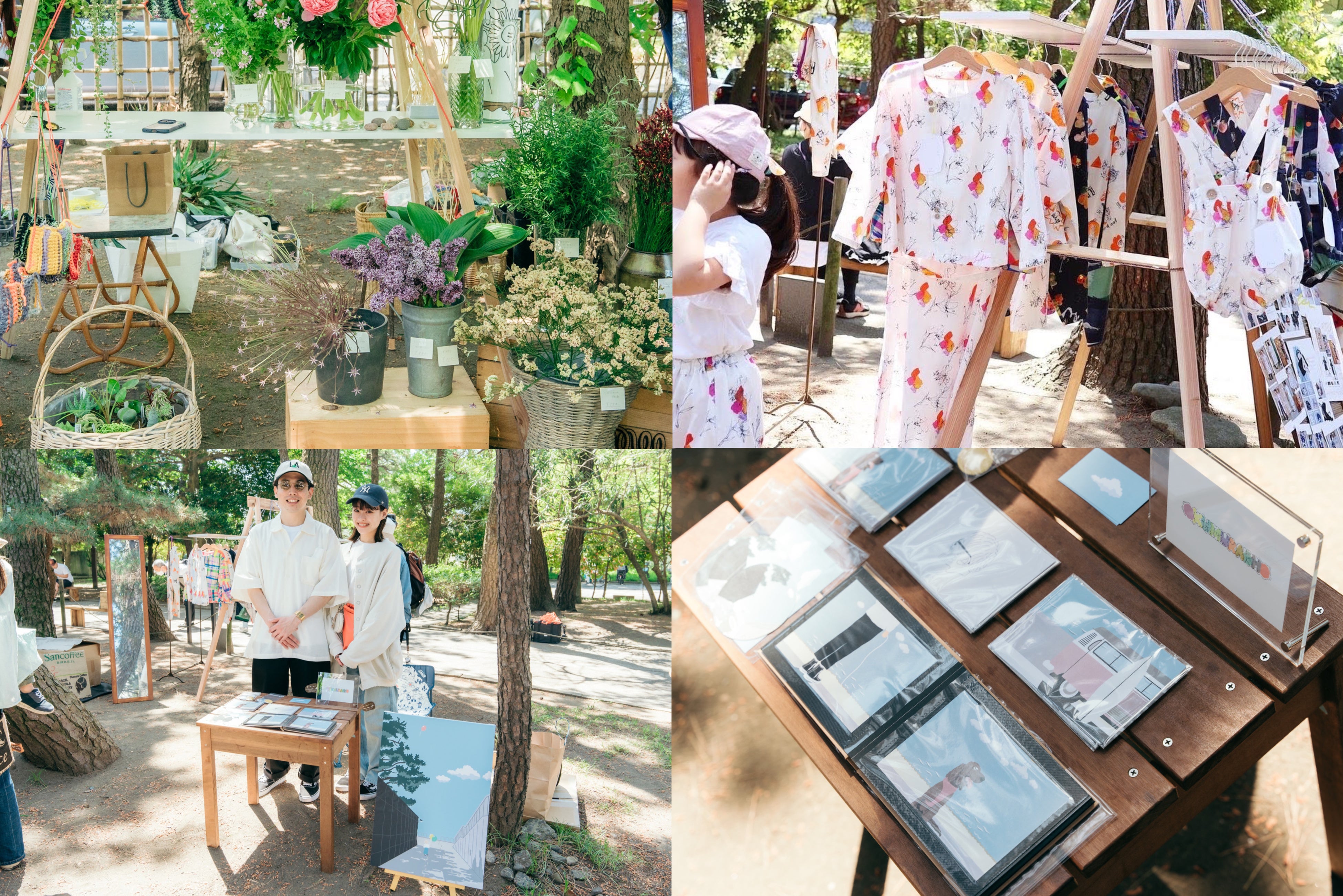 「umu.」では、みどりの日ということで、素敵な花や植物、「KiHEN」は生地や資材に無駄がないようオーダー製作をしているお洋服、今回のキービジュアルのイラストを担当した「OKUMURA SHO」は、イラストやイベント限定のコースターとしおりを販売しました。