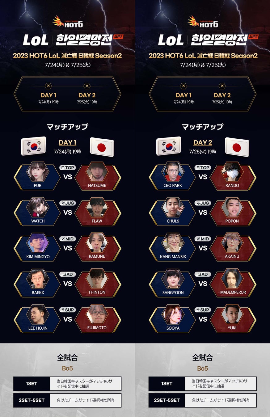 まず、24日に行われるDay1では、「HOT6 LoL 日韓滅亡戦シーズン1」で勝利した韓国のBJチームが出場し、25日に行われるDay2の試合では、シーズン1で韓国チームのコーチとして活躍した元LoLプロゲーマーのBJチームが出場する予定である。