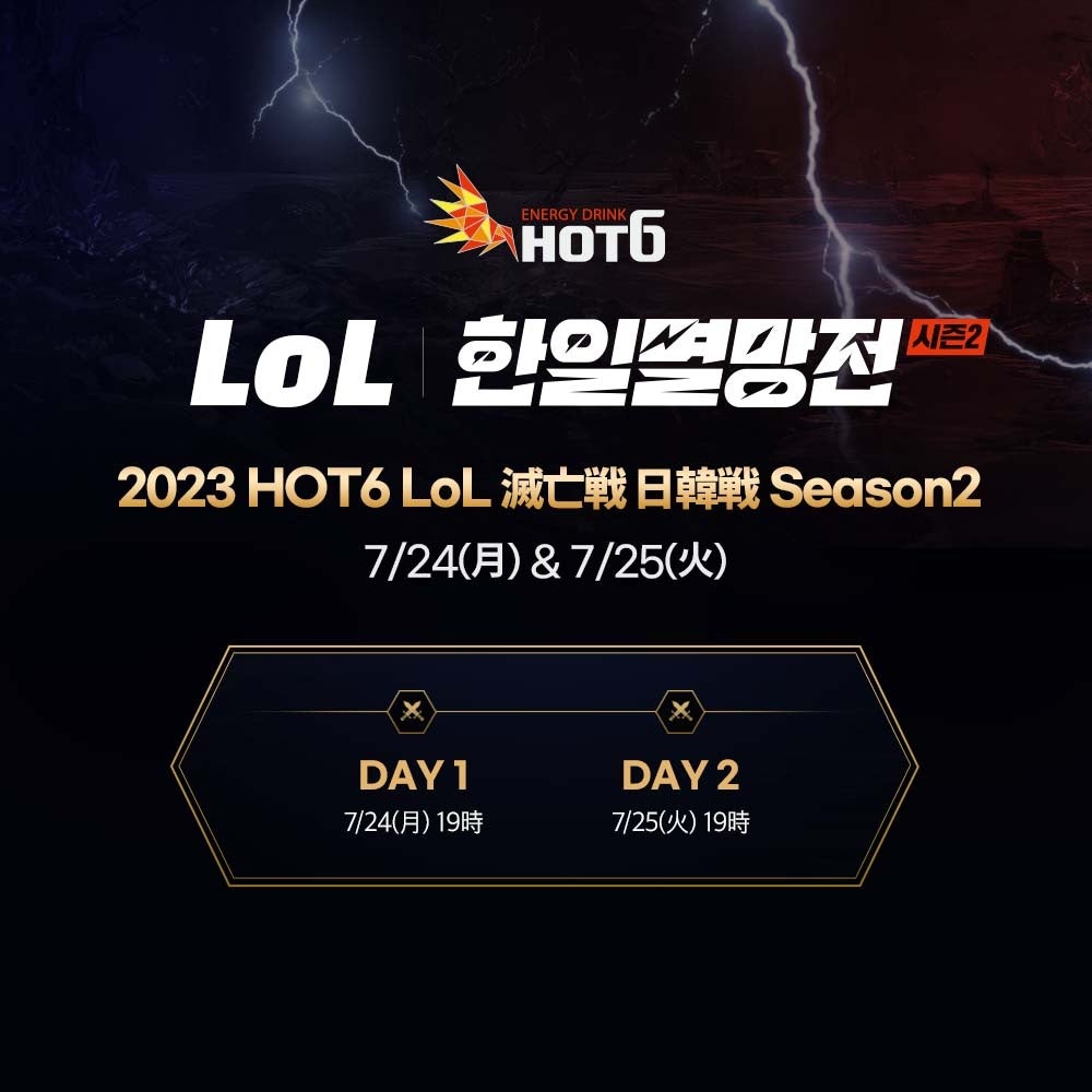 日韓の熱い関心を集めて行われた「HOT6 LoL 日韓滅亡戦シーズン1」に続き、今回のシーズン2でも、ライアットゲームズの人気PCオンラインゲーム「リーグ・オブ・レジェンド(League of Legends)」で、アフリカTVで活動する韓国の有名なLoLゲームBJたちが、日本のLJL(League of Legends Japan League)で活躍した元プロゲーマー選手たちとDay1とDay2に分かれて対決する予定である。