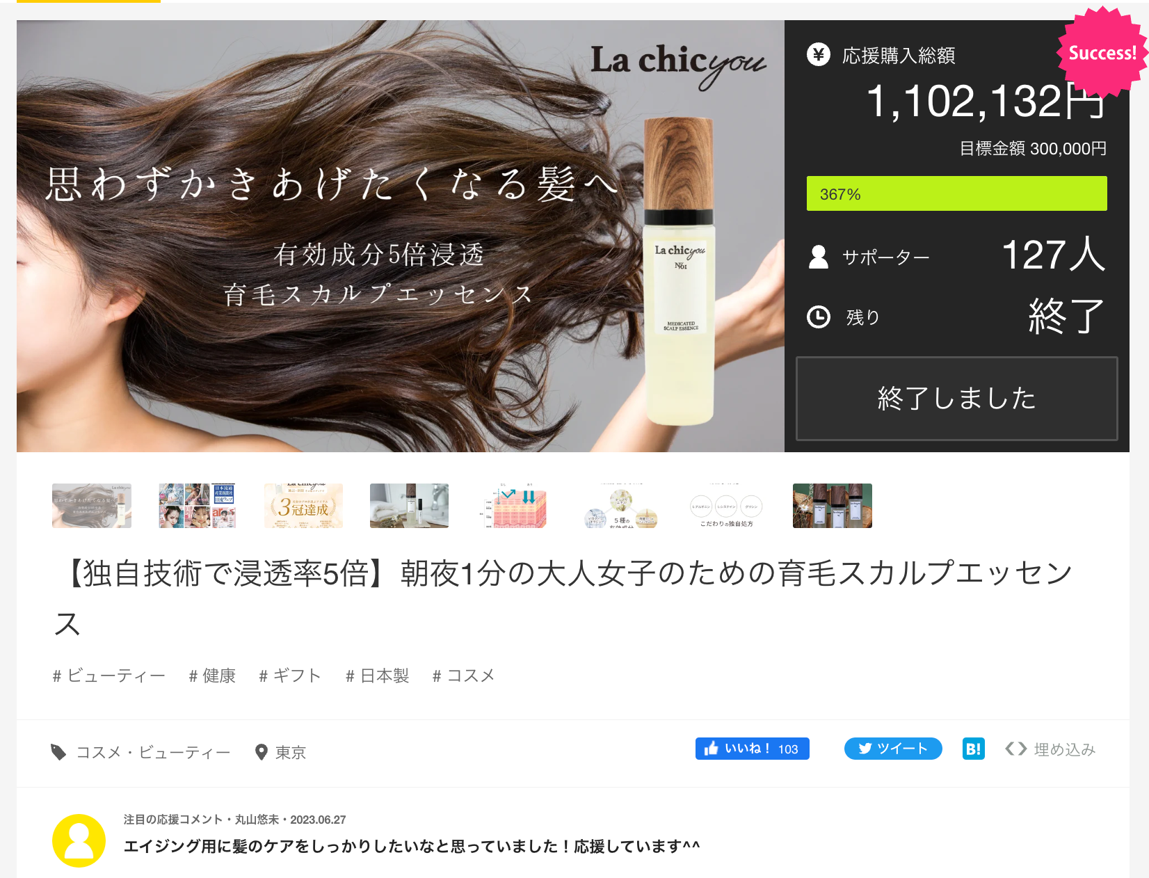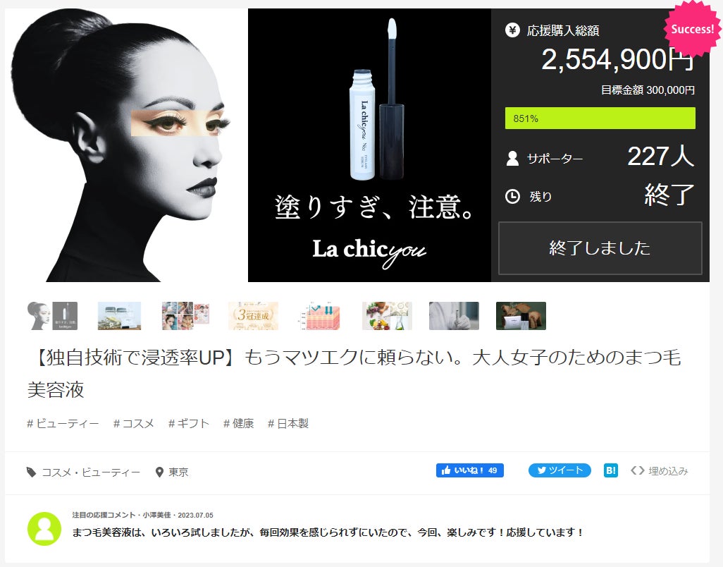 Makuakeプロジェクトでは、サポーターの皆さまのお陰で、La chicyou No.2 EYELASHI SERUM (ラシックユー No.2 アイラッシュ セラム)が、目標金額に対して851%と大きく達成することができました。今後は、自社ECサイト(https://www.tenshin-inc.com/)にてご購入頂けます。