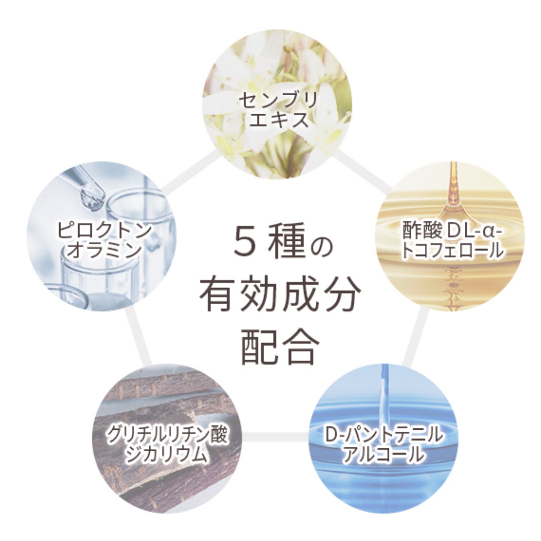 本製品は、医・薬・毛髪の専門家と共同開発した、発毛促進効果が示されている医薬部外品5成分、毛髪を作るアミノ酸5種以上をバランスよく配合し、育毛にアプローチできるよう成分設計しています。