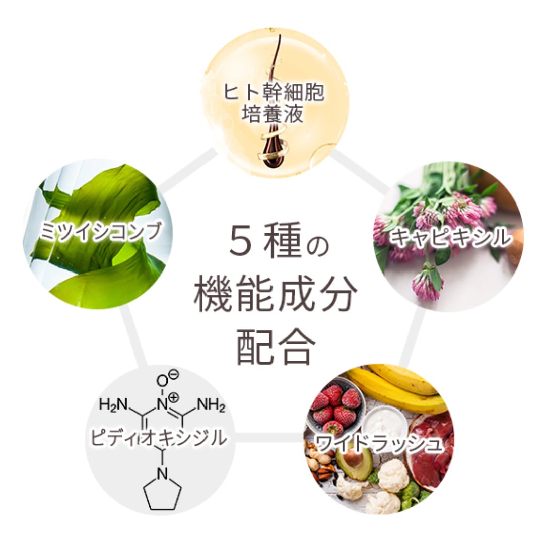 本製品は、医・薬・毛髪の専門家と共同開発した、美容業界で注目されている5種の機能成分である「ヒト幹細胞順化培養液エキス」、「キャピキシル」、「ピディオキシジル(ミノキシジル誘導体)」、「ワイドラッシュ」、「ミツイシコンブエキス」が配合されております。