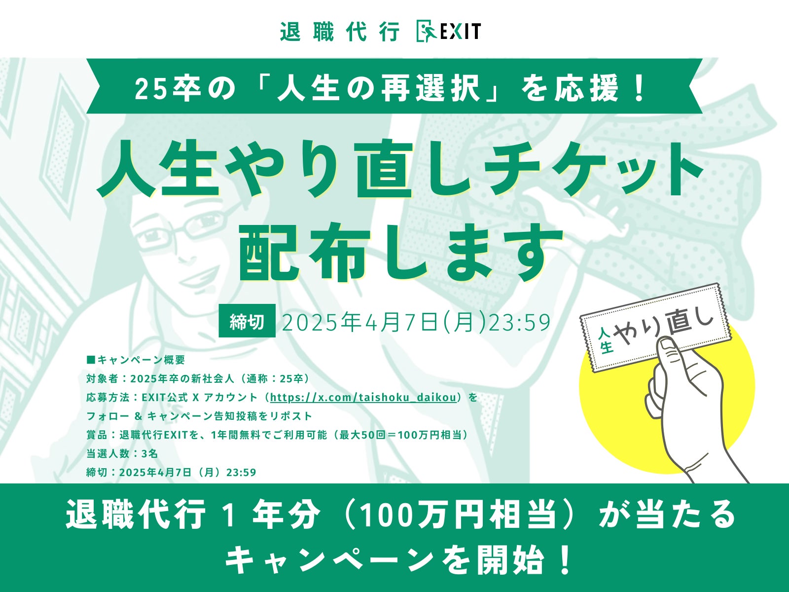 【退職代行EXIT】が25卒の「人生の再選択」を応援!退職代行1年分(100万円相当)が当たるキャンペーンを4月1日(火)より開始〜人生やり直しチケット配布します〜