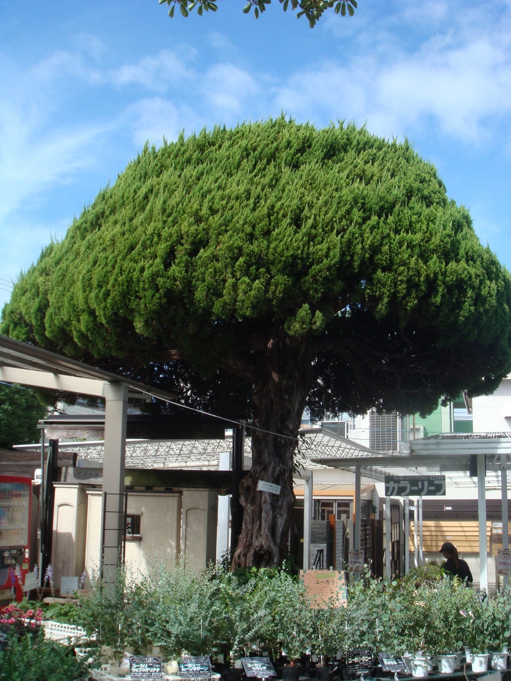 メインの丸く刈り込まれたカイズカイブキは樹齢120年。