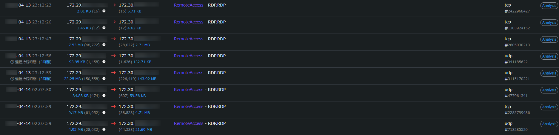 2.内部スキャンをしている外部IPアドレスとADサーバとのRDPセッションを検知