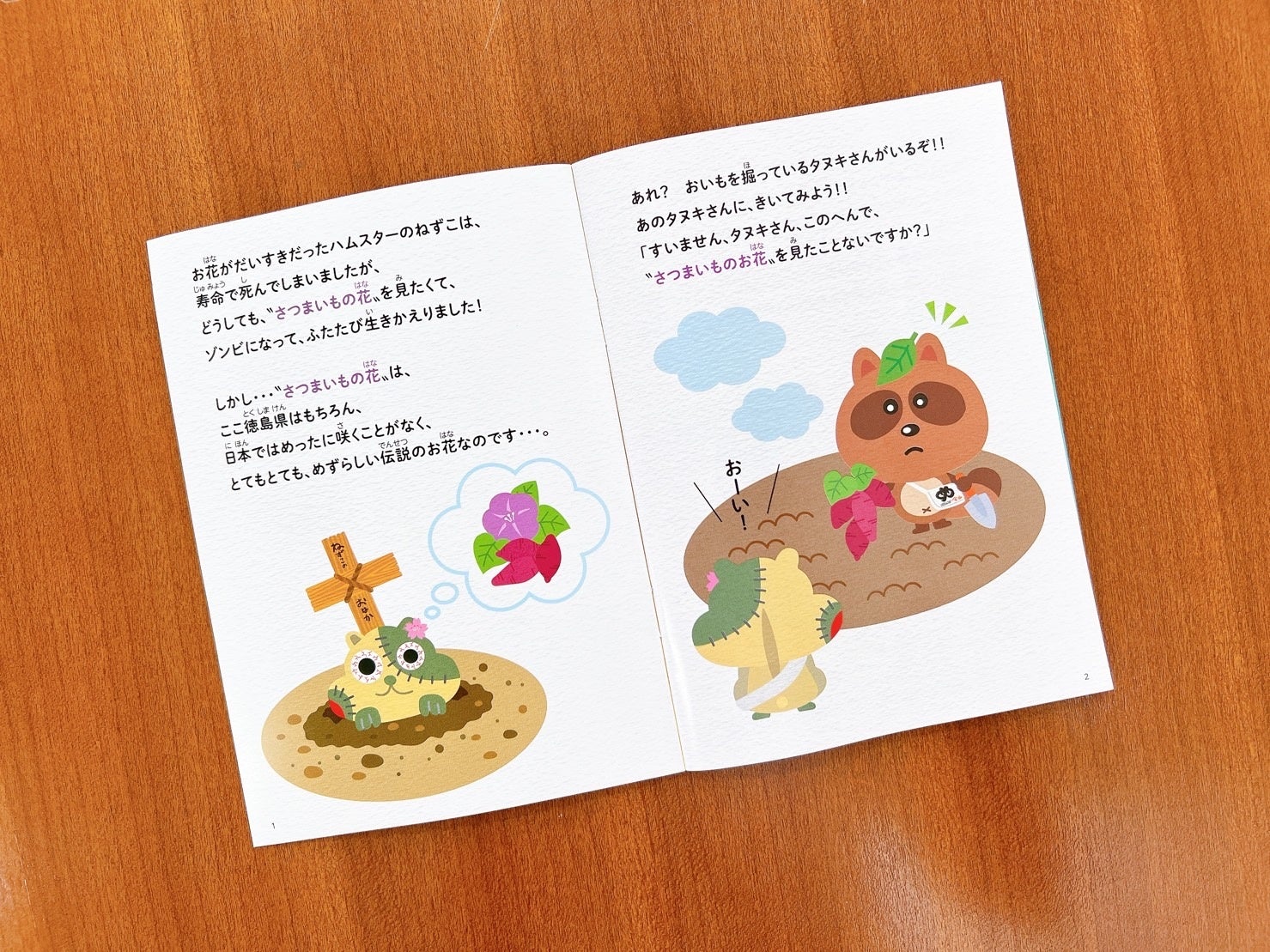 同封されている絵本は、原田たけし氏とハレルヤの絵本プロジェクトチームで考えた完全オリジナルストーリー。”ねずこ”と”ハレたん”が、徳島県の観光地を旅しながら『伝説のさつまいもの花』を探す大冒険の物語となっています。
