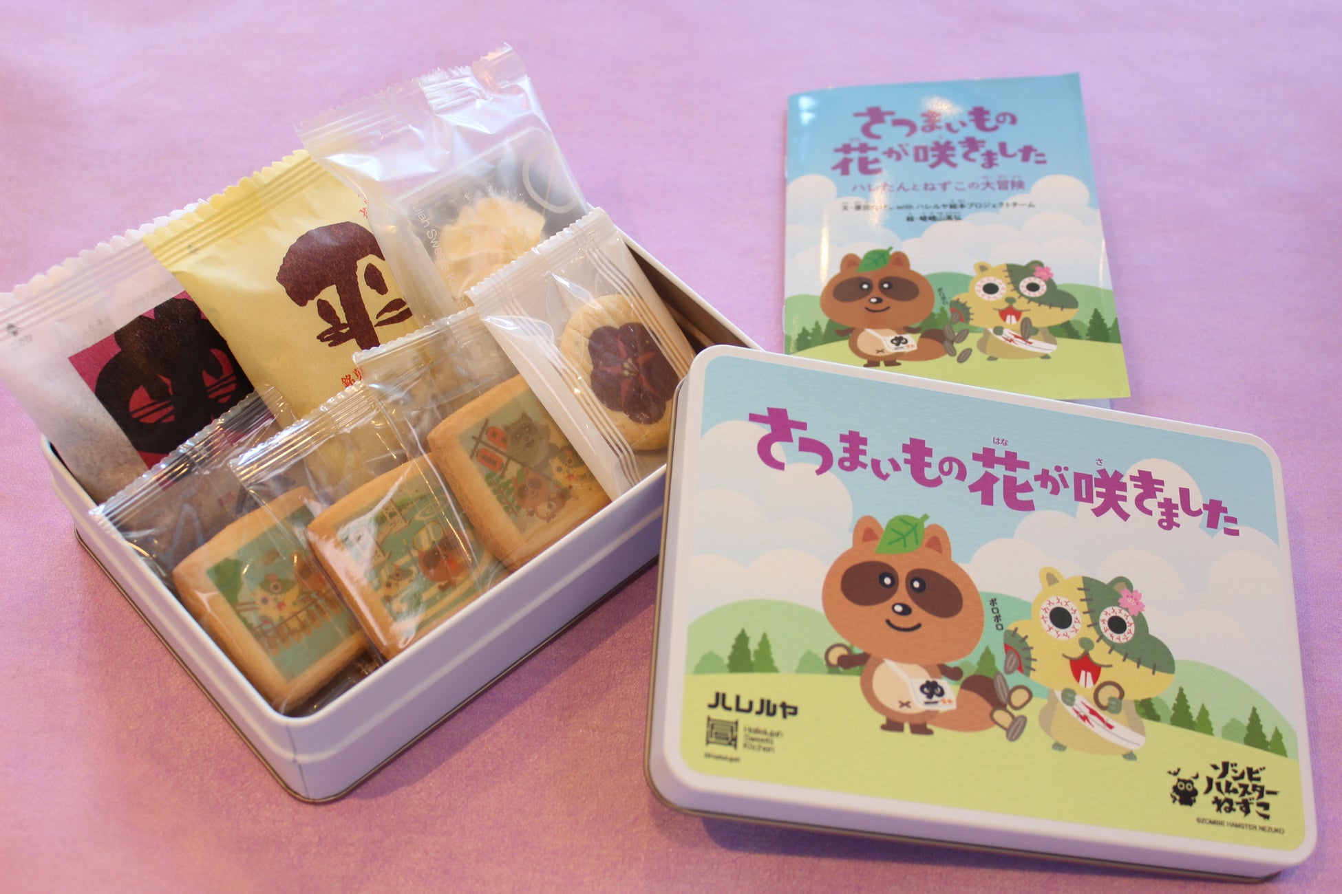 物語に登場する『さつまいもの花クッキー』は実際に製品としてお菓子缶に入っており、2人が旅した観光地の思い出写真をプリントしたクッキーも同封されています。見て楽しい!食べておいしい!絵本を読んだ後、クッキーを食べながら改めて絵本の世界観に浸ることができるので、是非お子様と一緒に楽しでいただきたい商品です♪