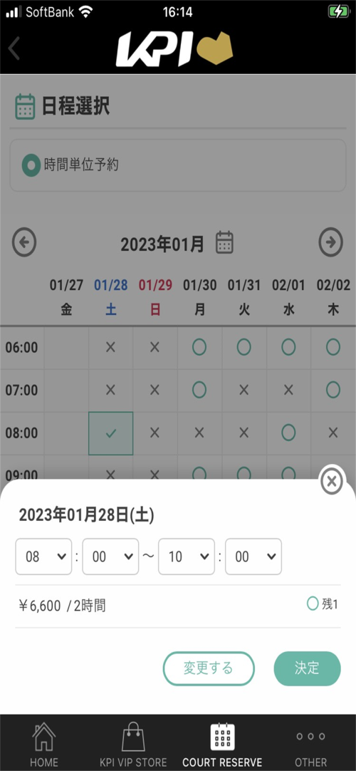 アプリ画面下部の予約アイコンより、KPIが運営するスポーツ施設の予約画面が表示されます。