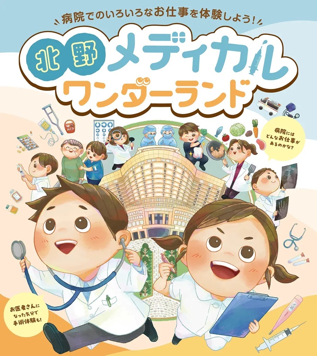 「北野メディカルワンダーランド2023」は、将来医療職をめざしていたり、医療職に興味があったりする子どもたちを対象に、病院のさまざまな職業を体験したり、病院の裏側を探検したりできるイベント。企画から運営まで、すべて医師や看護師、メディカルスタッフなど病院職員のみで行う“手作りの催し”です。