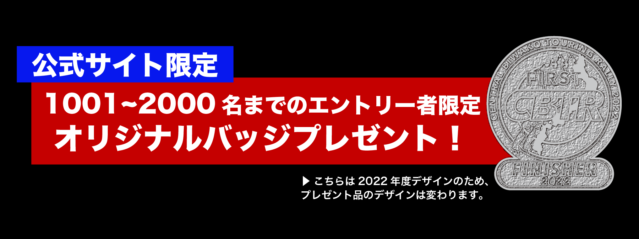 5/17のエントリー開始にあたっては、先着1000名様限定でCBTRオリジナルバッジ(非売品)のプレゼントキャンペーンをしておりましたが、予想を遥かに上回る反響をいただいたことから、急遽追加の感謝キャンペーンとして、公式サイトからラリーにエントリーいただいた1001〜2000名までの方限定で、公式グッズとして販売予定の「オリジナルバッジ」をプレゼントいたします。