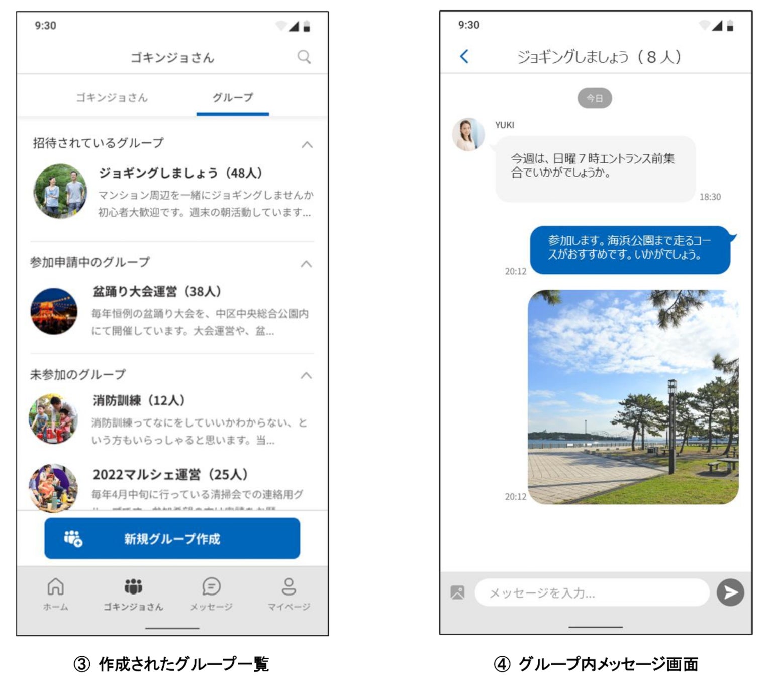 同じマンションの住民同士でグループ活動を行える「グループメッセージ機能」を新設しました。これまでも、GOKINJOユーザー同士のダイレクトメッセージ機能はありましたが、多くのユーザーから「GOKINJOアプリ上でグループを組成し活動したい」とのご要望があり、ユーザーの声を新機能に反映いたしました。この機能により、同じ趣味を持つ方や、共通の話題がある方、また、理事会や委員会などのグループ活動を実施しやすくなります。マンション内で仲間が集い、コミュニティ活動が活性化される効果を期待しています。