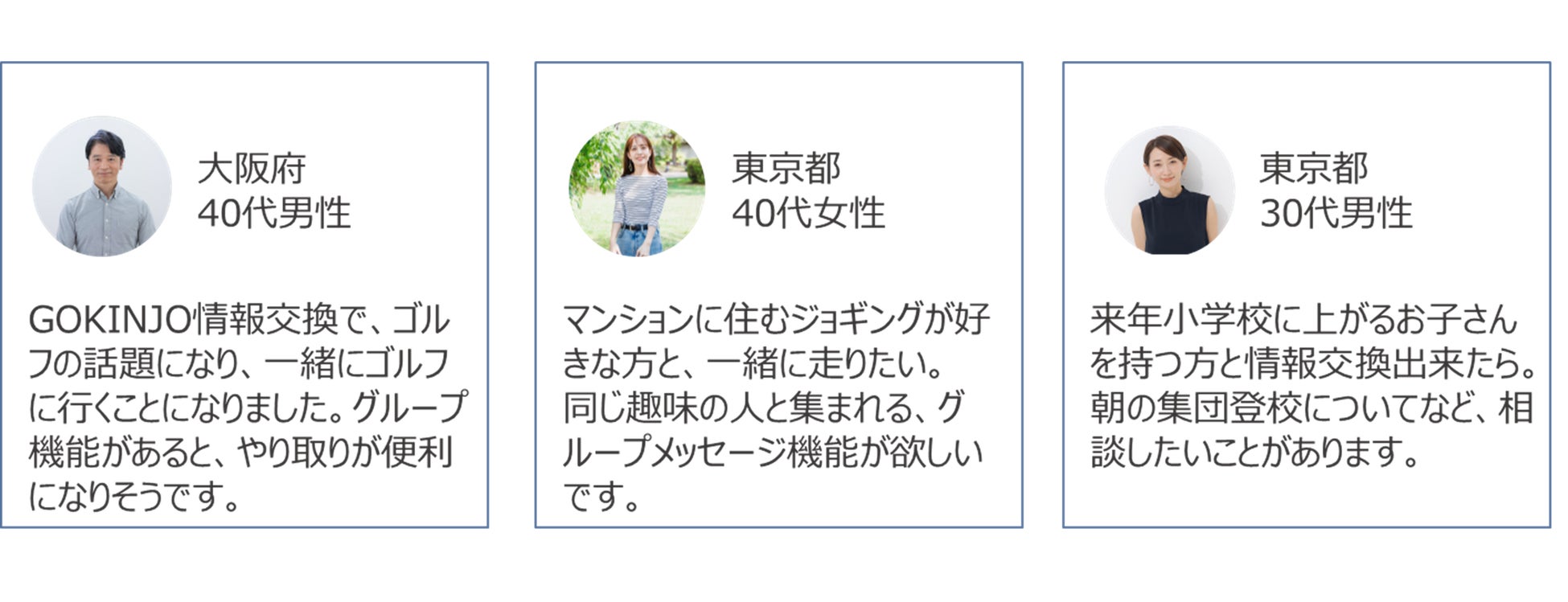 GOKINJOを利用中のユーザーから、「同じ趣味の方と集まりたい」「ゴルフに行く待ち合わせ時間の相談をしたい」「来年小学校に上がるお子さんを持つ方に相談したい」「理事会メンバーで議論する場がほしい」など、グループメッセージ機能について多数のご要望を頂き、新機能の開発につながりました。