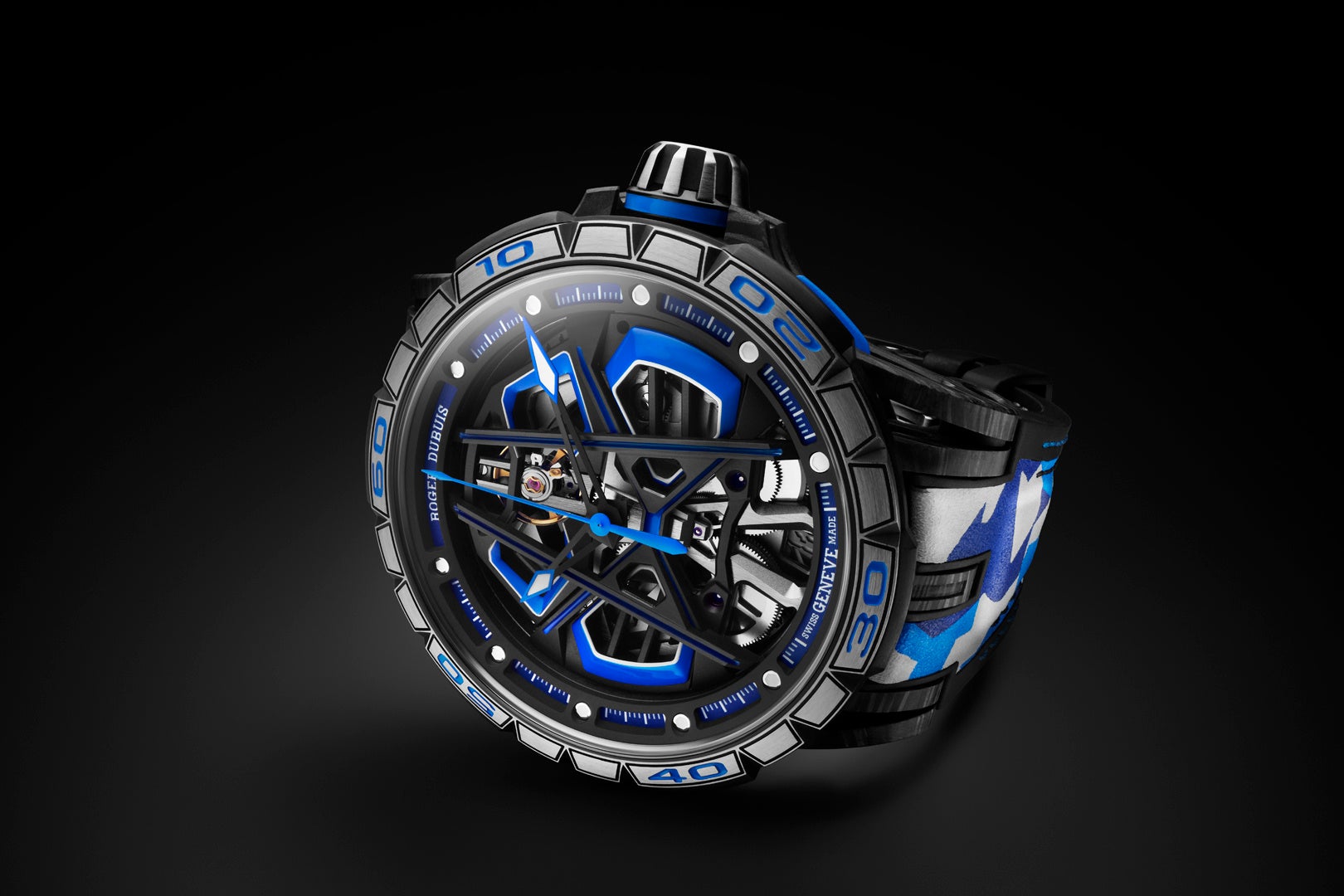 ケースの両サイドには、スーパーカーの特徴的なスポイラーを象徴するブルーのラバーストリップ、そしてウラカンのレーシングナットをイメージしたボルト型リューズを添えることで、ロジェ・デュブイにしか成し得ない斬新かつクリエイティブなスタイルを実現しています。