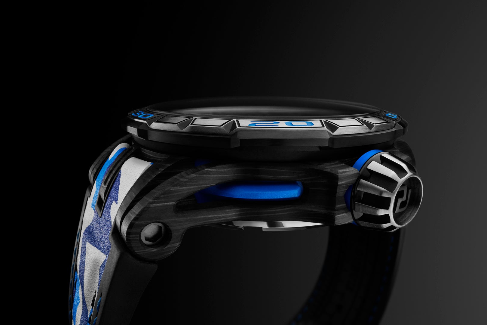 高い快適性とパフォーマンスを実現するために、45mmケースはシート成形コンパウンド (SMC) による加工カーボン (ゴールドよりも9倍も軽い合成物) を使用し、優れた耐久性と耐傷性、そして軽量性を同時に備えています。さらにケースには6つの主要な分目盛を際立たせたブラックのDLCチタン製ベゼルを備え、車の安全性を高めるフェンダーを模してデザインされています。SMCカーボン製ケースにブラックのDLCチタン製ベゼルを組み合わせることでスポーツカーを体現するような軽量性と耐久性の両立を実現し、日々待ち受ける様々な冒険を乗り越えるパートナーとして相応しい時計デザインが完成しました。