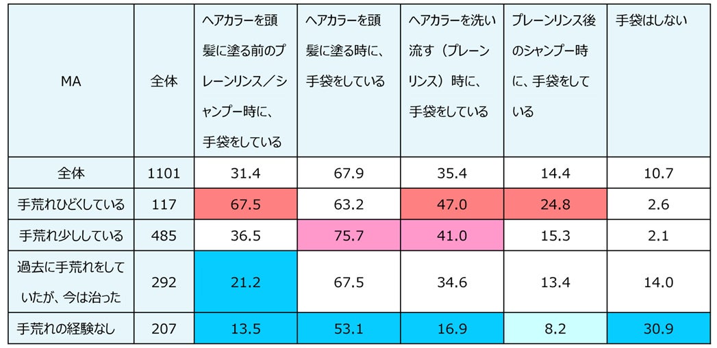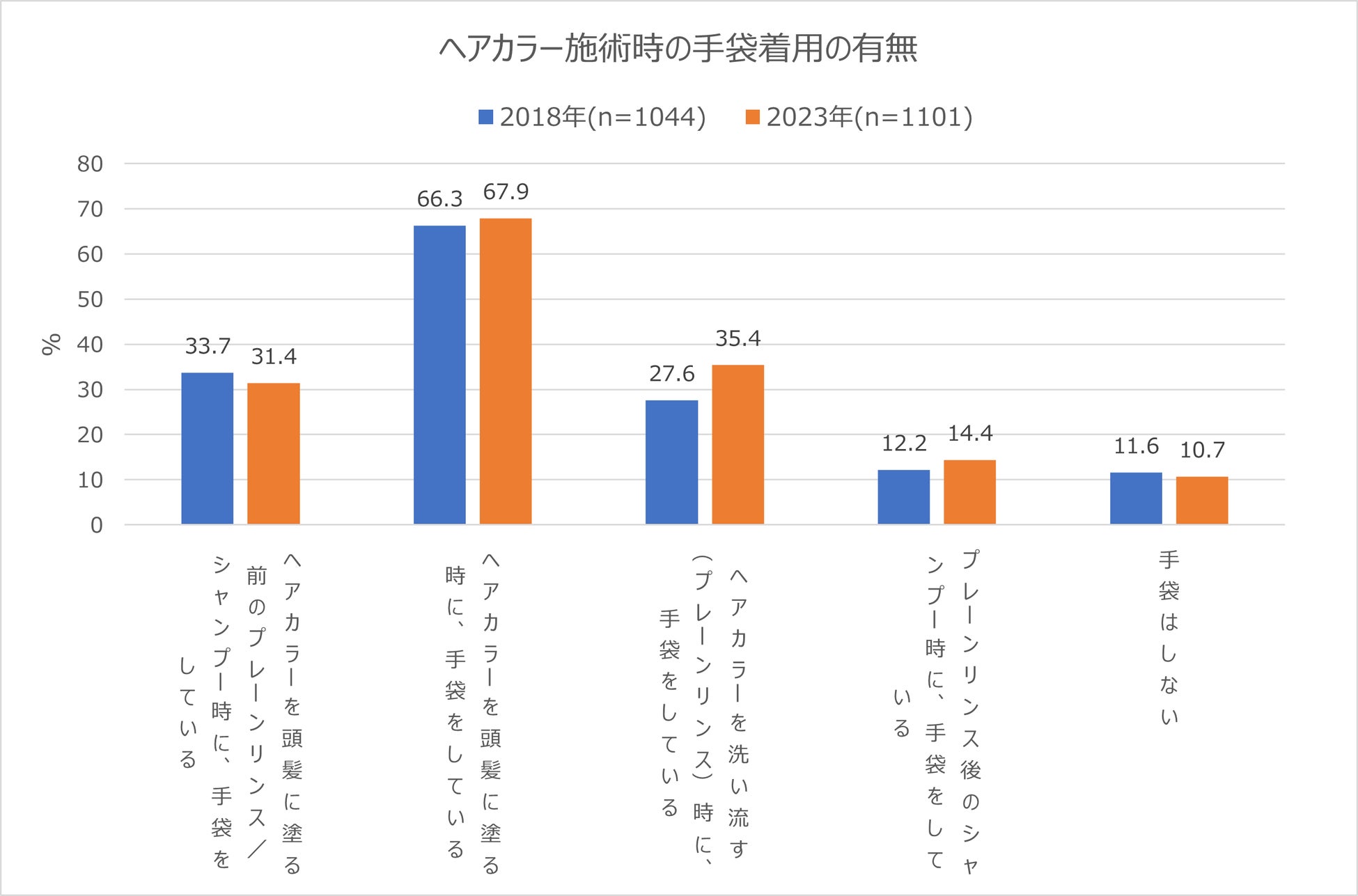 手袋着用は、ヘアカラーによる皮膚トラブルを予防する最も効果的な手段の一つであるため、今後も啓発活動や環境整備などを通じて、手袋着用率の向上に取り組むことが不可欠です。