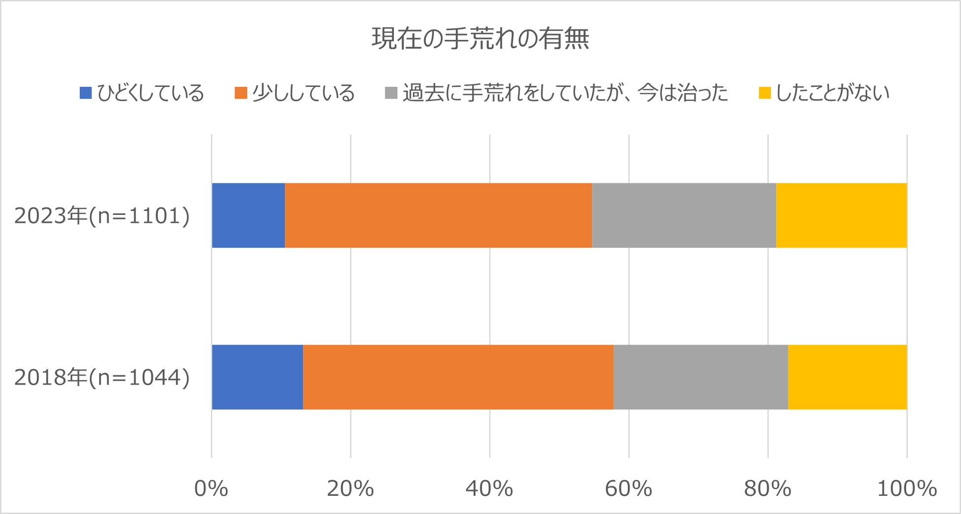 現在の手荒れの有無について、「ひどくしている」「少ししている」「過去に手荒れをしていたが、今は治った」に回答した合計は約81%。現在も手荒れをしている方(「ひどくしている」「少ししている」の回答者)は約55%でした。