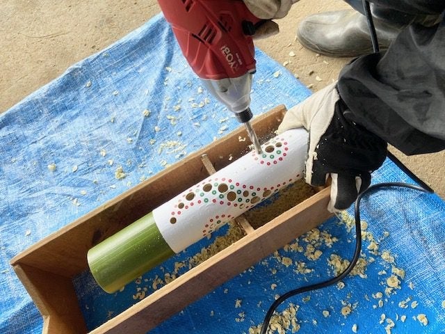 内容:公園で育った立派な真竹にドリルで穴をあけて模様を描き、竹灯ろうを作ります。模様は4種類から選べます♬