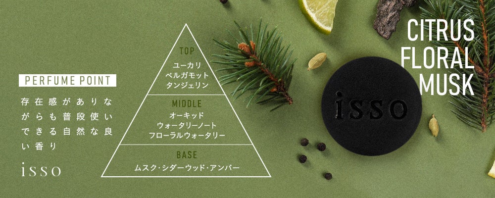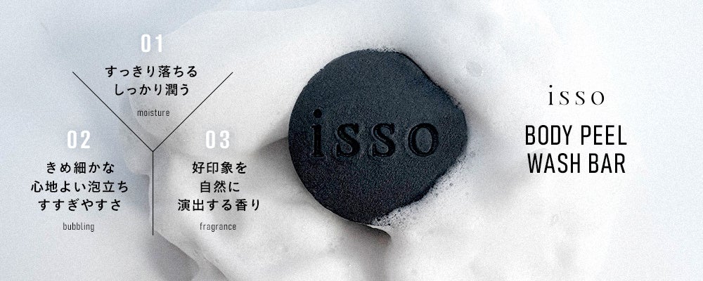 脂性肌特有の悩みをケアする「isso 香水石鹸」は、洗浄力と保湿力を独自製法でバランス良く両立させ、さらに、調香師がこだわりぬいた老若男女問わず好印象を持たれる香りが特徴のボディピールウォッシュバーです。