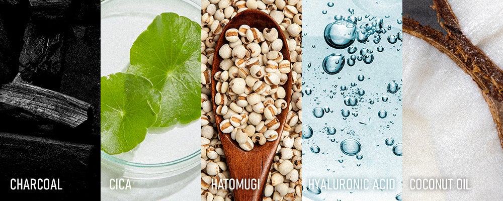 密着泡で不要な皮脂や汚れをスッキリ落とすだけでなく、潤いを与え、肌の調子を整えるサポート成分も配合。炭、ツボクサ、ハトムギ、ヒアルロン酸、ココナッツオイルが潤いと清潔感あふれる肌へと導きます。